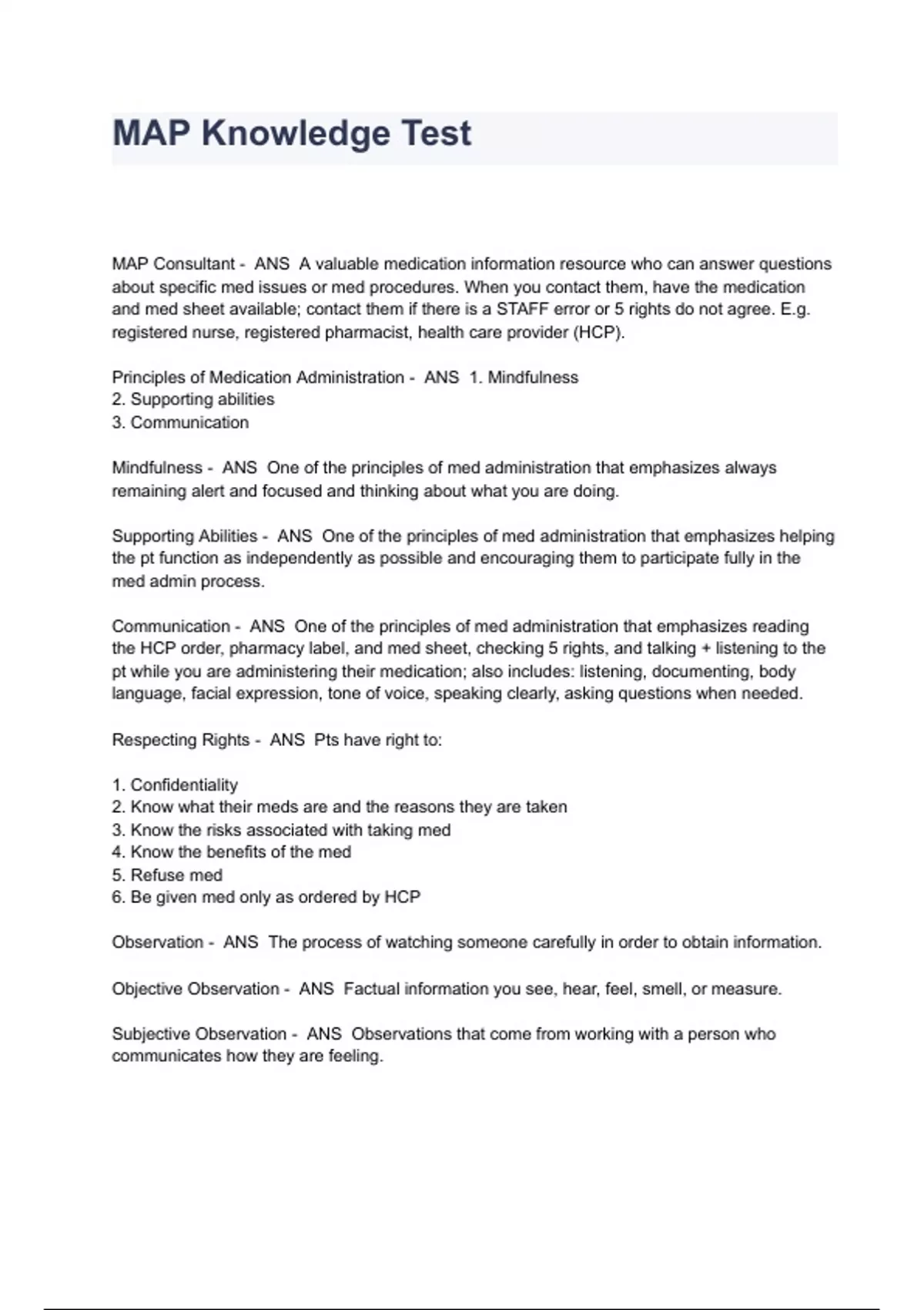 MAP Knowledge Test Questions And Answers MAP Consultant - ANS A valuable medication information resource who can answer questions about specific med issues or med procedures. When you contact them, have the medication and med sheet available; contact them if there is a STAFF error or 5 rights do not agree. E.g. registered nurse, registered pharmacist, health care provider (HCP). Principles of Medication Administration - ANS 1. Mindfulness 2. Supporting abilities 3. Communication Mindfulness - ANS One of the principles of med administration that emphasizes always remaining alert and focused and thinking about what you are doing. Supporting Abilities - ANS One of the principles of med administration that emphasizes helping the pt function as independently as possible and encouraging them to participate fully in the med admin process. Communication - ANS One of the principles of med administration that emphasizes reading the HCP order, pharmacy label, and med sheet, checking 5 rights, and talking + listening to the pt while you are administering their medication; also includes: listening, documenting, body language, facial expression, tone of voice, speaking clearly, asking questions when needed. Respecting Rights - ANS Pts have right to: 1. Confidentiality 2. Know what their meds are and the reasons they are taken 3. Know the risks associated with taking med 4. Know the benefits of the med 5. Refuse med 6. Be given med only as ordered by HCP Observation - ANS The process of watching someone carefully in order to obtain information. Objective Observation - ANS Factual information you see, hear, feel, smell, or measure. Subjective Observation - ANS Observations that come from working with a person who communicates how they are feeling. Reporting - ANS Giving spoken or written information of something observed or told. I am responsible for making note of any physical or behavioral changes in pt. Immediate Reporting - ANS Reporting without delay as soon as possible after a change is observed; may prevent a small change observed from becoming a major health issue and allows the appropriate treatment to be ordered ASAP. 911 - ANS The person to call when: -Pt falls and can't get up -Pt complains of chest pain, has difficulty breathing, or is choking -Pt is unresponsive -MAP Con. recommends you hang up and call Poison Controll - ANS The person to call when: -Pt ingests a foreign substance such as detergent -MAP Con. recommends you hang up and call MAP Consultant # - ANS The person to call when: -An occurrence (error) is made when administering med -Med received from pharmacy seems different from HCP order -I notice medication is different in color, size, shape, and/or markings from the last time it was obtained