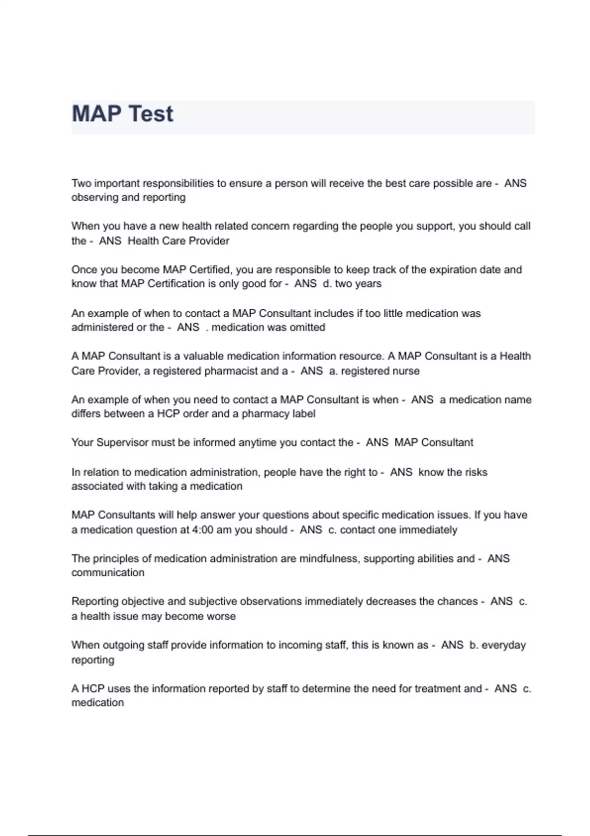 MAP Test Questions And Answers All Correct Two important responsibilities to ensure a person will receive the best care possible are - ANS observing and reporting When you have a new health related concern regarding the people you support, you should call the - ANS Health Care Provider Once you become MAP Certified, you are responsible to keep track of the expiration date and know that MAP Certification is only good for - ANS d. two years An example of when to contact a MAP Consultant includes if too little medication was administered or the - ANS . medication was omitted A MAP Consultant is a valuable medication information resource. A MAP Consultant is a Health Care Provider, a registered pharmacist and a - ANS a. registered nurse An example of when you need to contact a MAP Consultant is when - ANS a medication name differs between a HCP order and a pharmacy label Your Supervisor must be informed anytime you contact the - ANS MAP Consultant In relation to medication administration, people have the right to - ANS know the risks associated with taking a medication MAP Consultants will help answer your questions about specific medication issues. If you have a medication question at 4:00 am you should - ANS c. contact one immediately The principles of medication administration are mindfulness, supporting abilities and - ANS communication Reporting objective and subjective observations immediately decreases the chances - ANS c. a health issue may become worse When outgoing staff provide information to incoming staff, this is known as - ANS b. everyday reporting A HCP uses the information reported by staff to determine the need for treatment and - ANS c. medication Two important responsibilities to ensure a person will receive the best care possible are - ANS observing and reporting When you have a new health related concern regarding the people you support, you should call the - ANS Health Care Provider Once you become MAP Certified, you are responsible to keep track of the expiration date and know that MAP Certification is only good for - ANS d. two years An example of when to contact a MAP Consultant includes if too little medication was administered or the - ANS . medication was omitted A MAP Consultant is a valuable medication information resource. A MAP Consultant is a Health Care Provider, a registered pharmacist and a - ANS a. registered nurse An example of when you need to contact a MAP Consultant is when - ANS a medication name differs between a HCP order and a pharmacy label Your Supervisor must be informed anytime you contact the - ANS MAP Consultant In relation to medication administration, people have the right to - ANS know the risks associated with taking a medication MAP Consultants will help answer your questions about specific medication issues. If you have a medication question at 4:00 am you should - ANS c. contact one immediately The principles of medication administration are mindfulness, supporting abilities and - ANS communication Reporting objective and subjective observations immediately decreases the chances - ANS c. a health issue may become worse When outgoing staff provide information to incoming staff, this is known as - ANS b. everyday reporting A HCP uses the information reported by staff to determine the need for treatment and - ANS c. medication