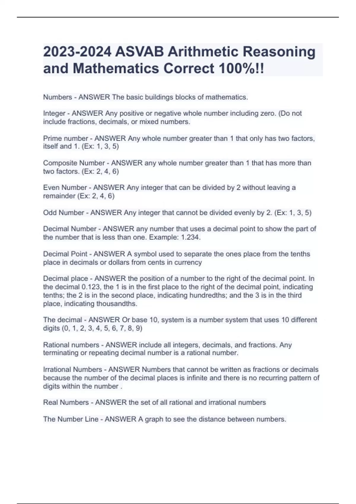 Numbers - ANSWER The basic buildings blocks of mathematics. Integer - ANSWER Any positive or negative whole number including zero. (Do not include fractions, decimals, or mixed numbers. Prime number - ANSWER Any whole number greater than 1 that only has two factors, itself and 1. (Ex: 1, 3, 5) Composite Number - ANSWER any whole number greater than 1 that has more than two factors. (Ex: 2, 4, 6) Even Number - ANSWER Any integer that can be divided by 2 without leaving a remainder (Ex: 2, 4, 6) Odd Number - ANSWER Any integer that cannot be divided evenly by 2. (Ex: 1, 3, 5) Decimal Number - ANSWER any number that uses a decimal point to show the part of the number that is less than one. Example: 1.234. Decimal Point -