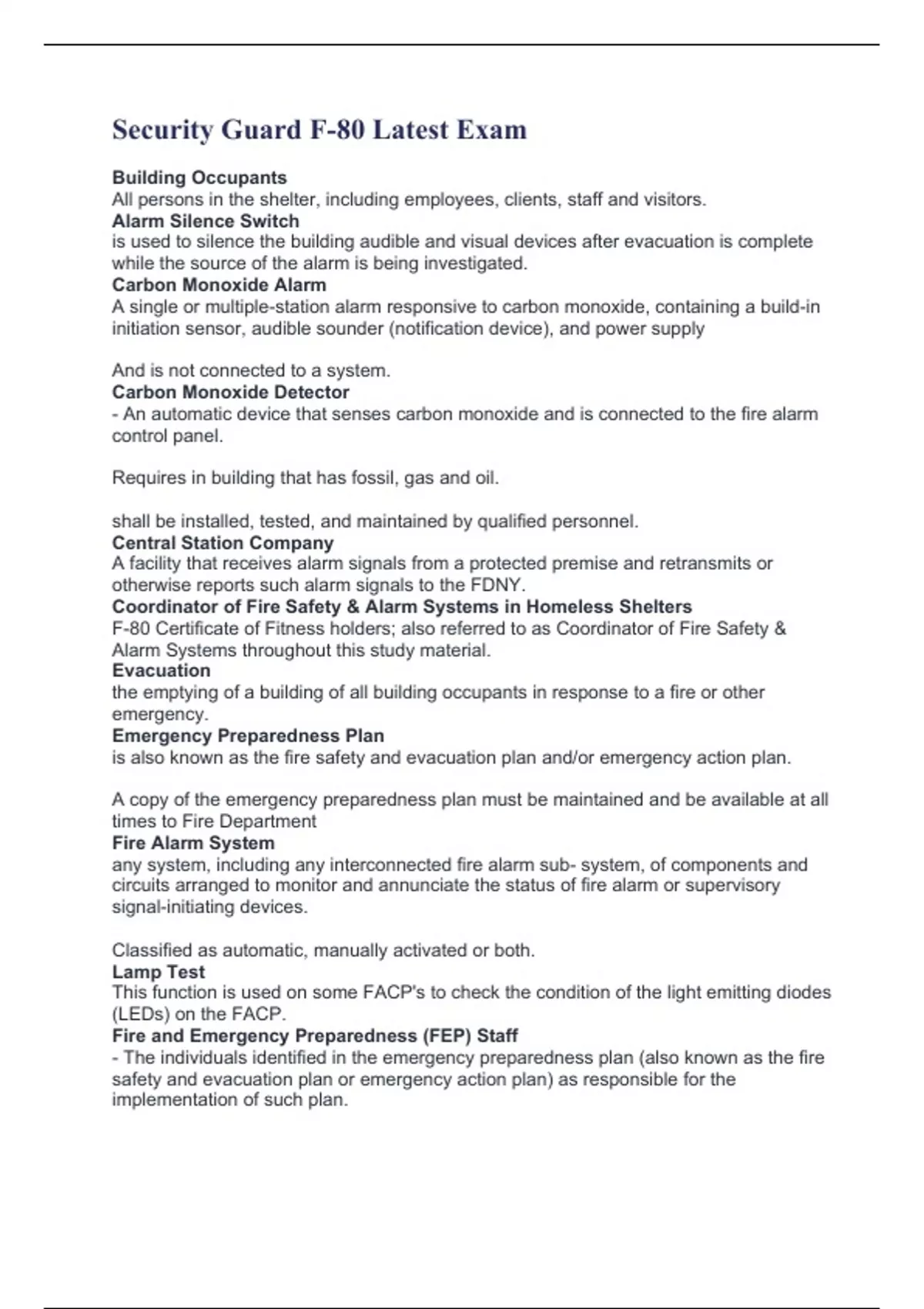 Security Guard F-80 Latest Exam Building Occupants All persons in the shelter, including employees, clients, staff and visitors. Alarm Silence Switch is used to silence the building audible and visual devices after evacuation is complete while the source of the alarm is being investigated. Carbon Monoxide Alarm A single or multiple-station alarm responsive to carbon monoxide, containing a build-in initiation sensor, audible sounder (notification device), and power supply And is not connected to a system. Carbon Monoxide Detector - An automatic device that senses carbon monoxide and is connected to the fire alarm control panel. Requires in building that has fossil, gas and oil. shall be installed, tested, and maintained by qualified personnel. Central Station Company A facility that receives alarm signals from a protected premise and retransmits or otherwise reports such alarm signals to the FDNY. Coordinator of Fire Safety & Alarm Systems in Homeless Shelters F-80 Certificate of Fitness holders; also referred to as Coordinator of Fire Safety & Alarm Systems throughout this study material. Evacuation the emptying of a building of all building occupants in response to a fire or other