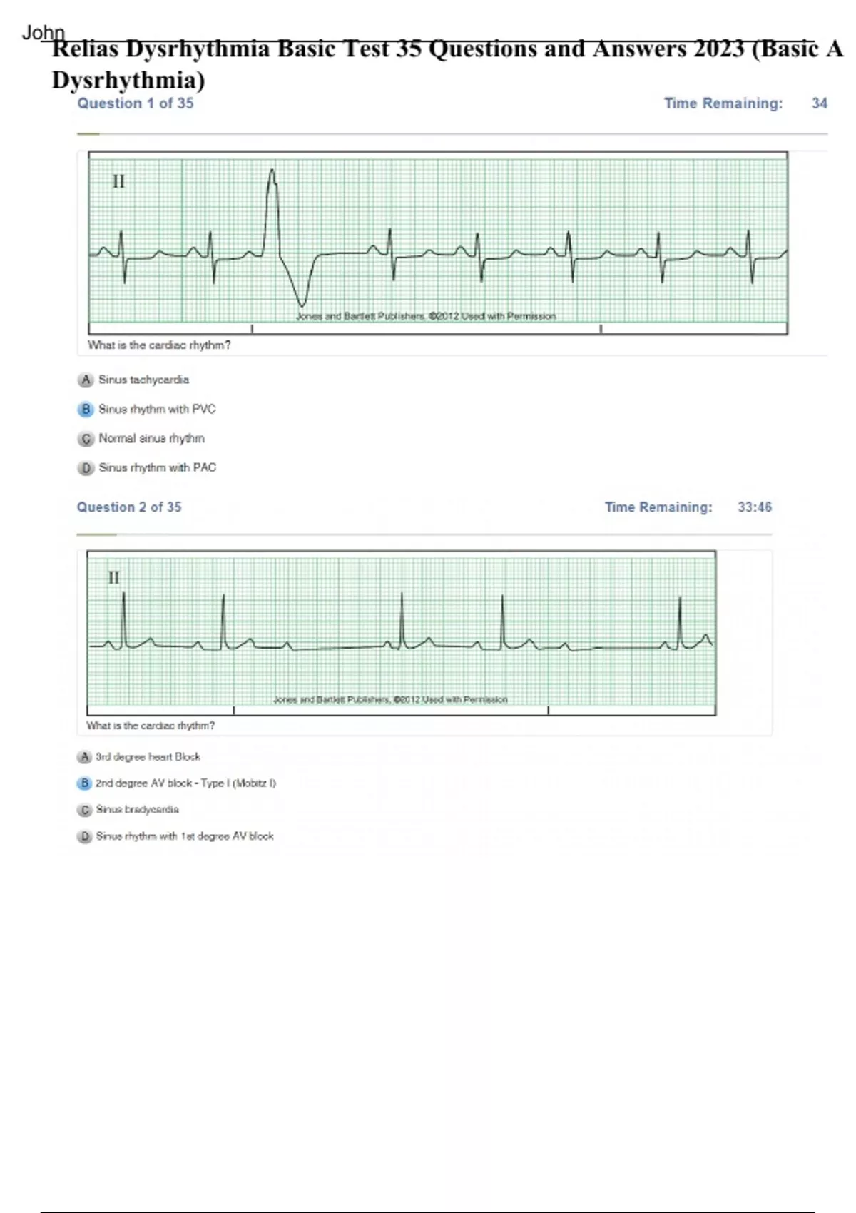 Relias Dysrhythmia Basic A Test 35 Questions and Verified Solutions / A Grade Document includes name of rhythm and picture of EKG strip from Relias exam * note: not ALL answers provided, only 32 out of 35 - see description below * 26 Q's: rhythm name with picture from exam. 9 Q's: rhythms with no pictures (6 with name of rhythm included, 3 unknown rhythms) Relias Dysrhythmia Basic Test 35 Questions and Answers 2023 (Basic A Dysrhythmia)