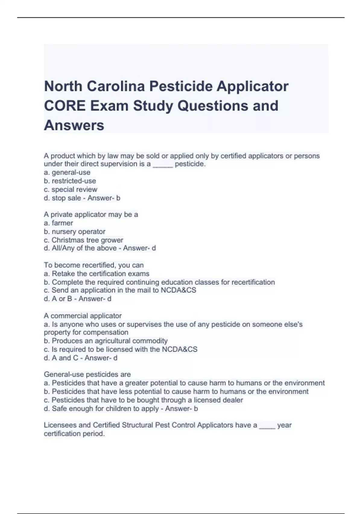 North Carolina Pesticide Applicator CORE Exam Study Questions and Answers