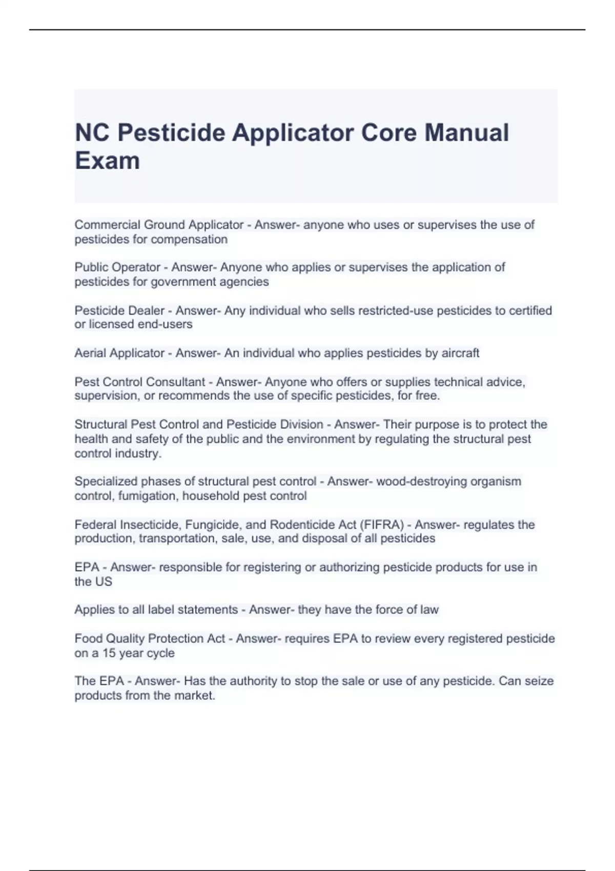NC Pesticide Applicator Core Manual Exam Questions with correct Answers