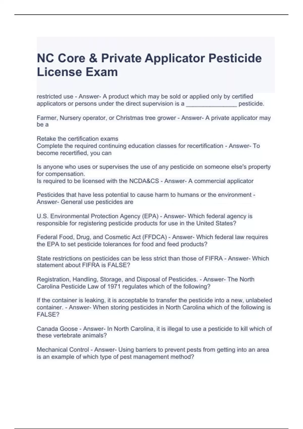 NC Core & Private Applicator Pesticide License Exam Questions and Answers