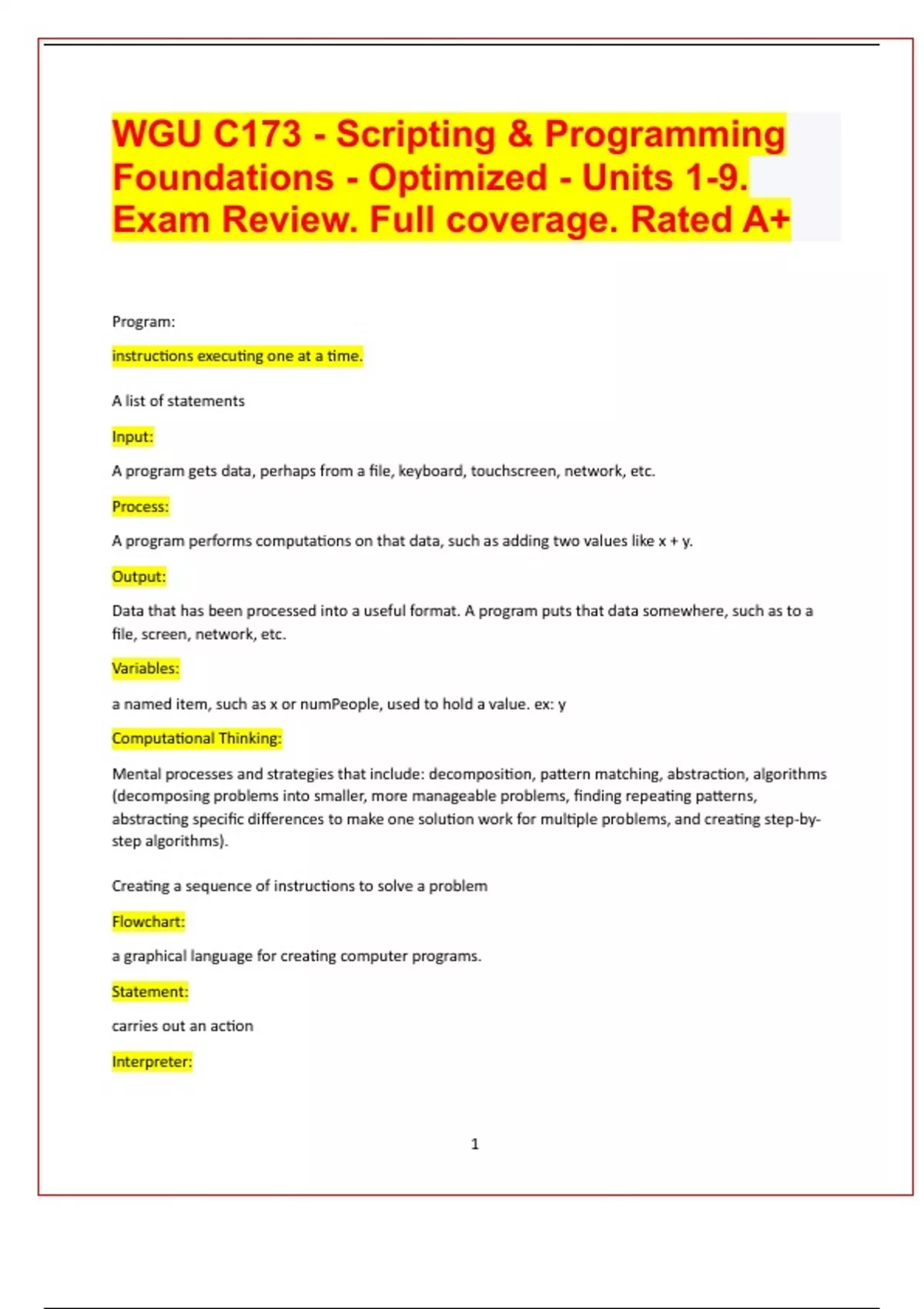 WGU C173 - Scripting & Programming Foundations - Optimized - Units 1-9. Exam Review. Full coverage. Rated A+