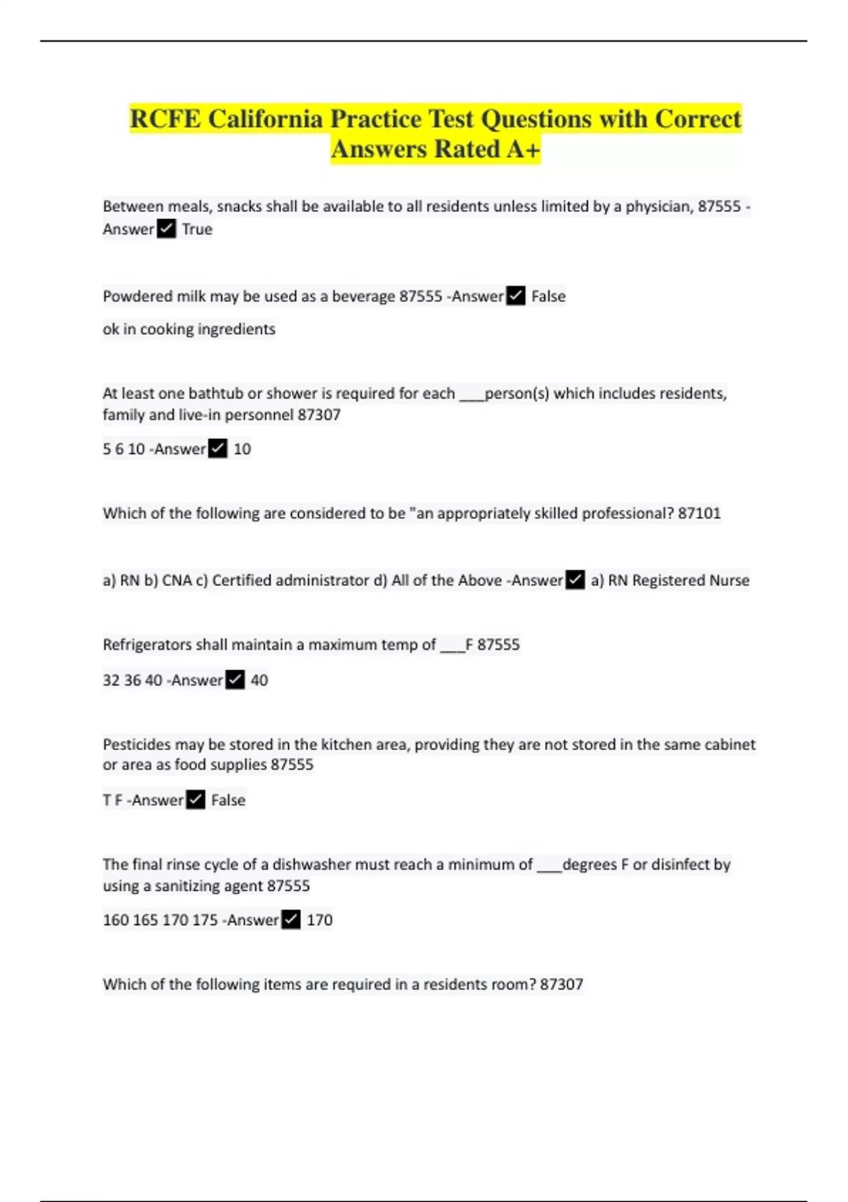 Between meals, snacks shall be available to all residents unless limited by a physician, 87555 - AnswerTrue Powdered milk may be used as a beverage 87555 -AnswerFalse ok in cooking ingredients At least one bathtub or shower is required for each ___person(s) which includes residents, family and live-in personnel 87307 5 6 10 -Answer10 Which of the following are considered to be "an appropriately skilled professional? 87101 a) RN b) CNA c) Certified administrator d) All of the Above -Answera) RN Registered Nurse Refrigerators shall maintain a maximum temp of ___F 87555 32 36 40 -Answer40