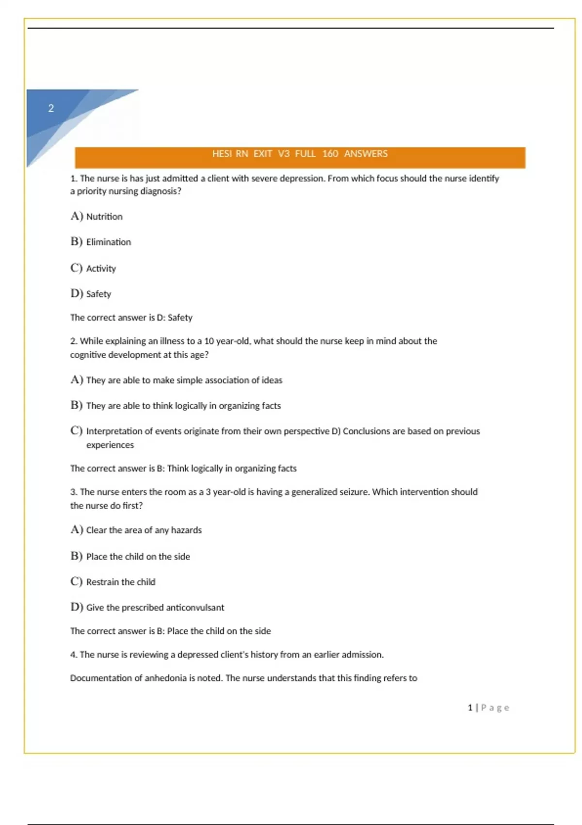 HESI RN EXIT V3 FULL 160 ANSWERS The nurse is has just admitted a client with severe depression. From which focus should the nurse identify a priority nursing diagnosis?