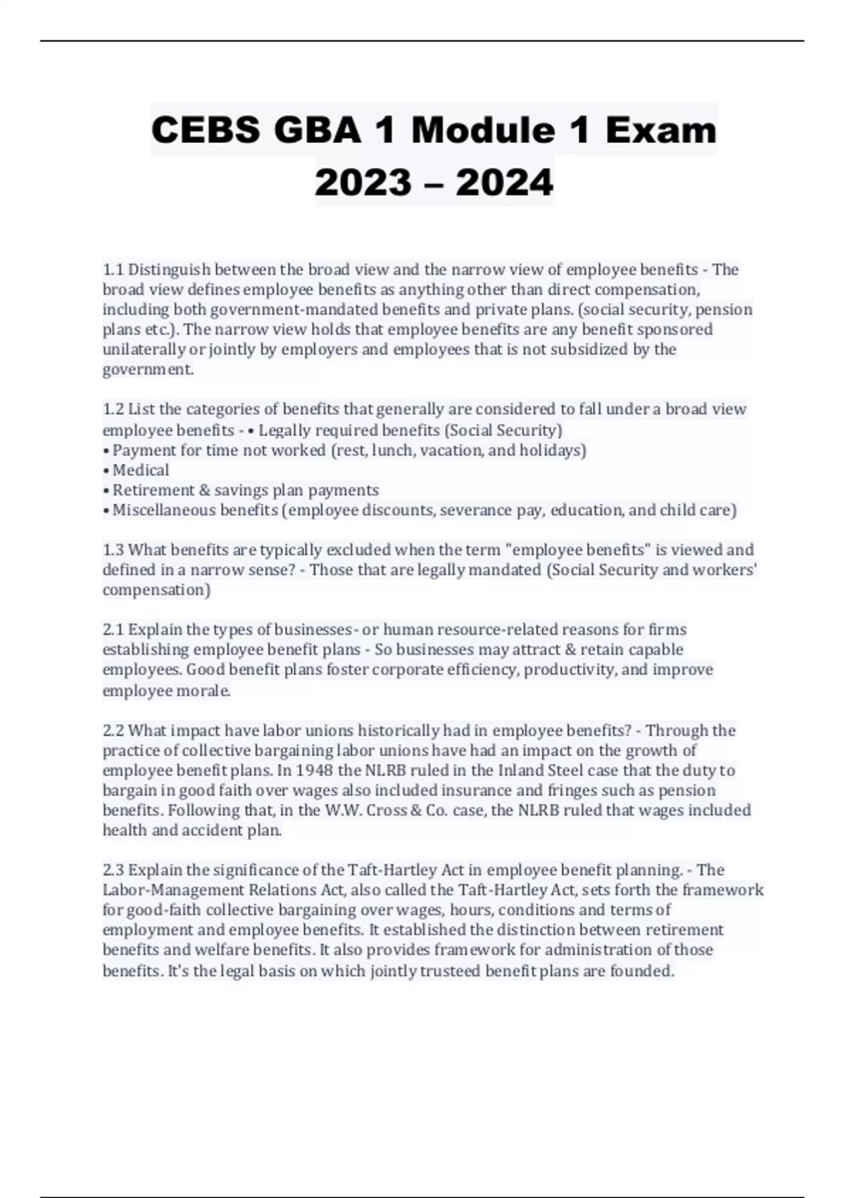 CEBS GBA Exam Study Bundle 100% Solved