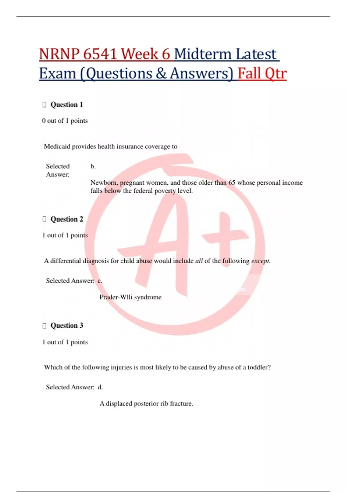 NRNP 6541 Week 6 Midterm Latest Exam (Questions & Answers) Fall Qtr Question 1 0 out of 1 points Medicaid provides health insurance coverage to Selected Answer: b. Newborn, pregnant women, and those older than 65 whose personal income falls below the federal poverty level. • Question 2 1 out of 1 points A differential diagnosis for child abuse would include all of the following except. Selected Answer: c. Prader-Wlli syndrome • Question 3 1 out of 1 points Which of the following injuries is most likely to be caused by abuse of a toddler? Selected Answer: d. A displaced posterior rib fracture. • Question 4 1 out of 1 points You are doing a kindergarten physical on a 5-year-old girl. Which of the following scenarios would suggest the child is not ready to start kindergarten in the fall? Selected Answer: a. Counts to 4 and draws a person with three parts.