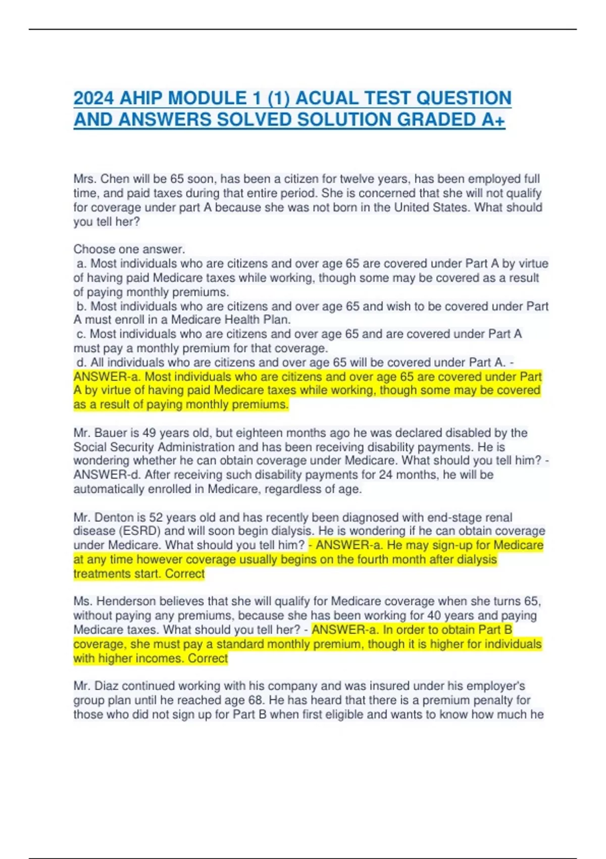 2024 AHIP MODULE 1 (1) ACUAL TEST QUESTION AND ANSWERS SOLVED SOLUTION GRADED A+ Mrs. Chen will be 65 soon, has been a citizen for twelve years, has been employed full time, and paid taxes during that entire period. She is concerned that she will not qualify for coverage under part A because she was not born in the United States. What should you tell her? Choose one answer. a. Most individuals who are citizens and over age 65 are covered under Part A by virtue of having paid Medicare taxes while working, though some may be covered as a result of paying monthly premiums. b. Most individuals who are citizens and over age 65 and wish to be covered under Part A must enroll in a Medicare Health Plan. c. Most individuals who are citizens and over age 65 and are covered under Part A must pay a monthly premium for that coverage. d. All individuals who are citizens and over age 65 will be covered under Part A. - ANSWER-a. Most individuals who are citizens and over age 65 are covered under Part A by virtue of having paid Medicare taxes while working, though some may be covered as a result of paying monthly premiums. Mr. Bauer is 49 years old, but eighteen months ago he was declared disabled by the Social Security Administration and has been receiving disability payments. He is wondering whether he can obtain coverage under Medicare. What should you tell him? - ANSWER-d. After receiving such disability payments for 24 months, he will be automatically enrolled in Medicare, regardless of age. Mr. Denton is 52 years old and has recently been diagnosed with end-stage renal disease (ESRD) and will soon begin dialysis. He is wondering if he can obtain coverage under Medicare. What should you tell him? - ANSWER-a. He may sign-up for Medicare at any time however coverage usually begins on the fourth month after dialysis treatments start. Correct Ms. Henderson believes that she will qualify for Medicare coverage when she turns 65, without paying any premiums, because she has been working for 40 years and paying Medicare taxes. What should you tell her? - ANSWER-a. In order to obtain Part B coverage, she must pay a standard monthly premium, though it is higher for individuals with higher incomes. Correc