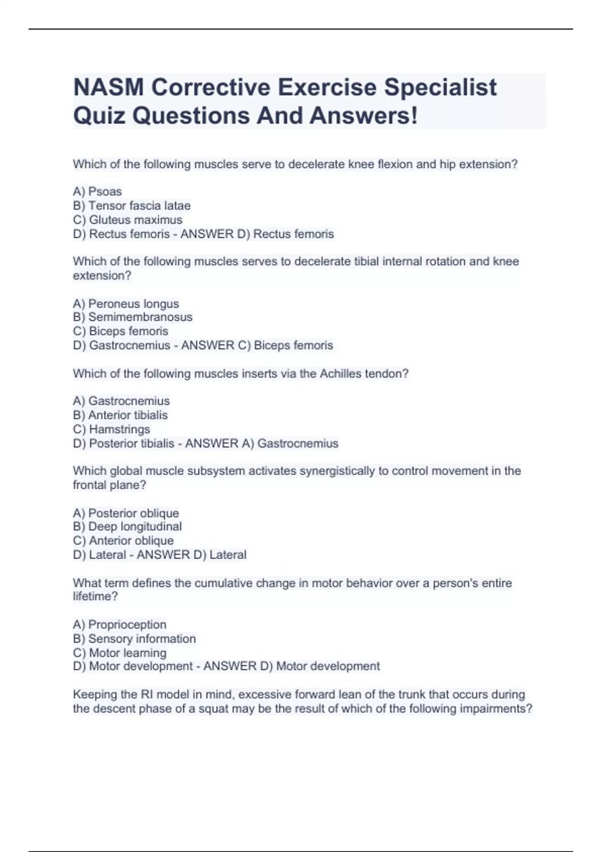 Which of the following muscles serve to decelerate knee flexion and hip extension? A) Psoas B) Tensor fascia latae C) Gluteus maximus D) Rectus femoris - ANSWER D) Rectus femoris Which of the following muscles serves to decelerate tibial internal rotation and knee extension? A) Peroneus longus B) Semimembranosus C) Biceps femoris D) Gastrocnemius - ANSWER C) Biceps femoris Which of the following muscles inserts via the Achilles tendon? A) Gastrocnemius B) Anterior tibialis C) Hamstrings D) Posterior tibialis - ANSWER A) Gastrocnemius Which global muscle subsystem activates synergistically to control movement in the frontal plane? A) Posterior oblique B) Deep longitudinal C) Anterior oblique D) Lateral - ANSWER D) Lateral What term defines the cumulative change in motor behavior over a person's entire lifetime? A) Proprioception
