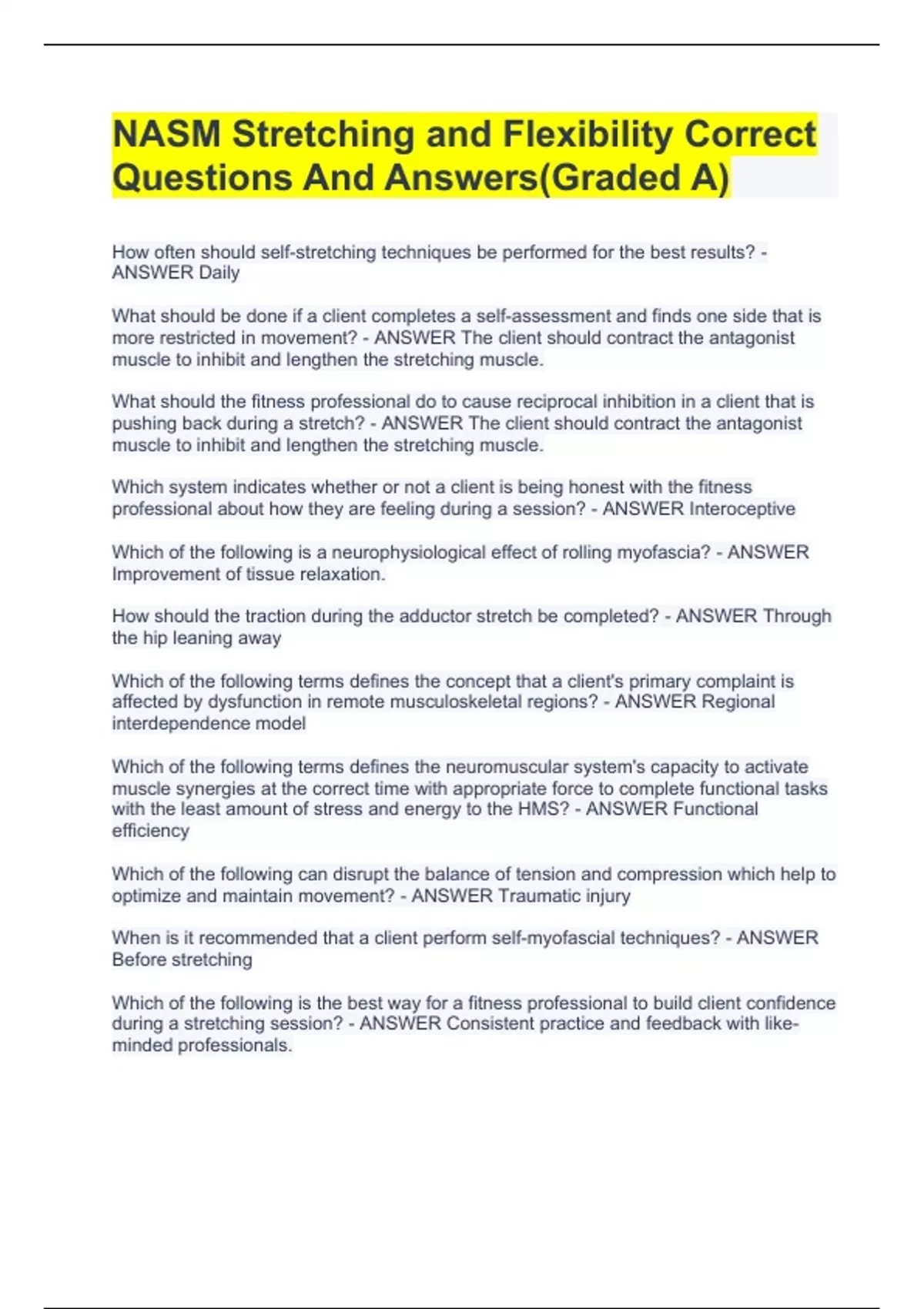 NASM Stretching and Flexibility Correct Questions And Answers(Graded A) How often should self-stretching techniques be performed for the best results? - ANSWER Daily What should be done if a client completes a self-assessment and finds one side that is more restricted in movement? - ANSWER The client should contract the antagonist muscle to inhibit and lengthen the stretching muscle. What should the fitness professional do to cause reciprocal inhibition in a client that is pushing back during a stretch? - ANSWER The client should contract the antagonist muscle to inhibit and lengthen the stretching muscle. Which system indicates whether or not a client is being honest with the fitness professional about how they are feeling during a session? - ANSWER Interoceptive Which of the following is a neurophysiological effect of rolling myofascia? - ANSWER Improvement of tissue relaxation. How should the traction during the adductor stretch be completed? - ANSWER Through the hip leaning away Which of the following terms defines the concept that a client's primary complaint is affected by dysfunction in remote musculoskeletal regions? - ANSWER Regional i