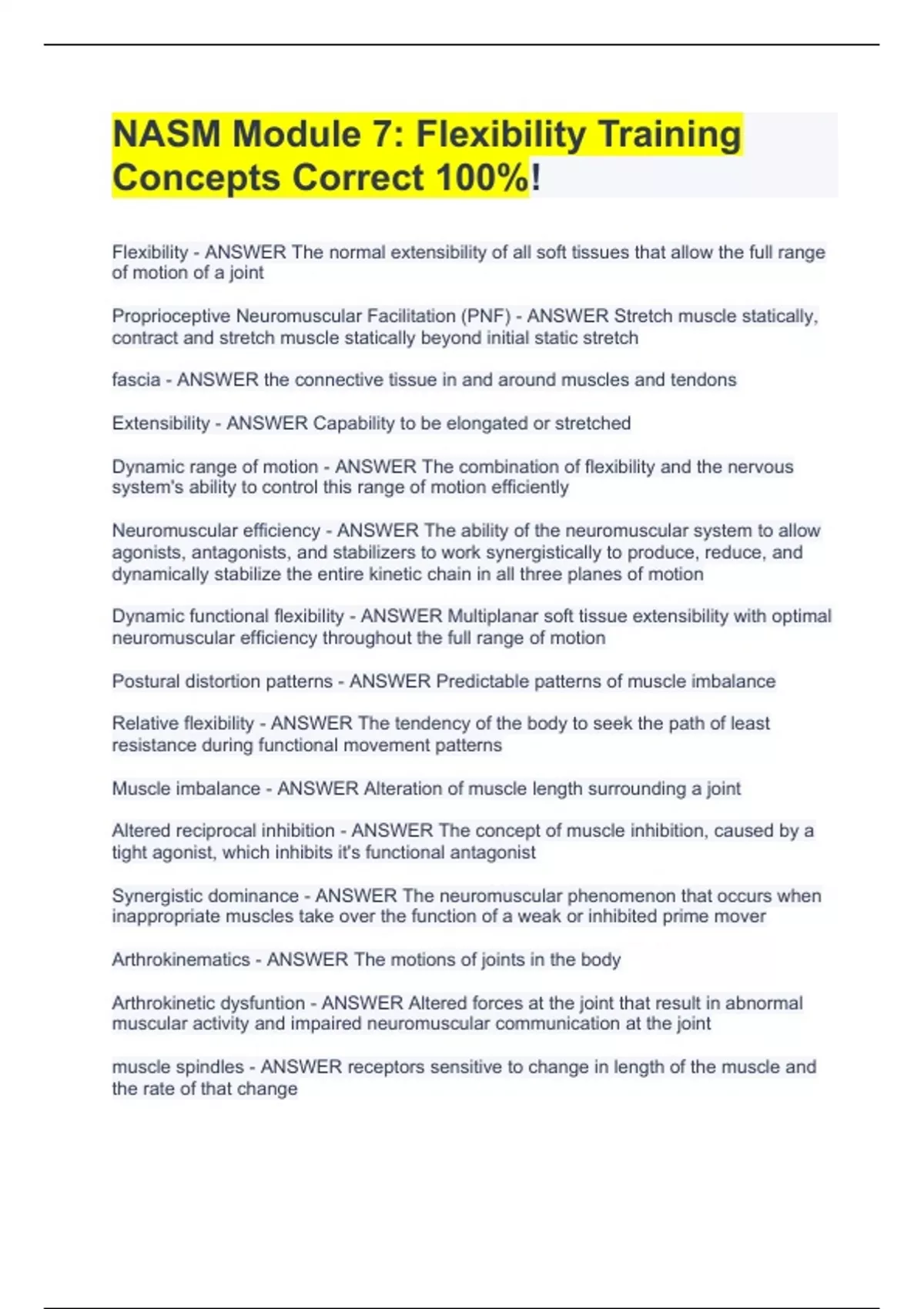 NASM Module 7: Flexibility Training Concepts Correct 100%!