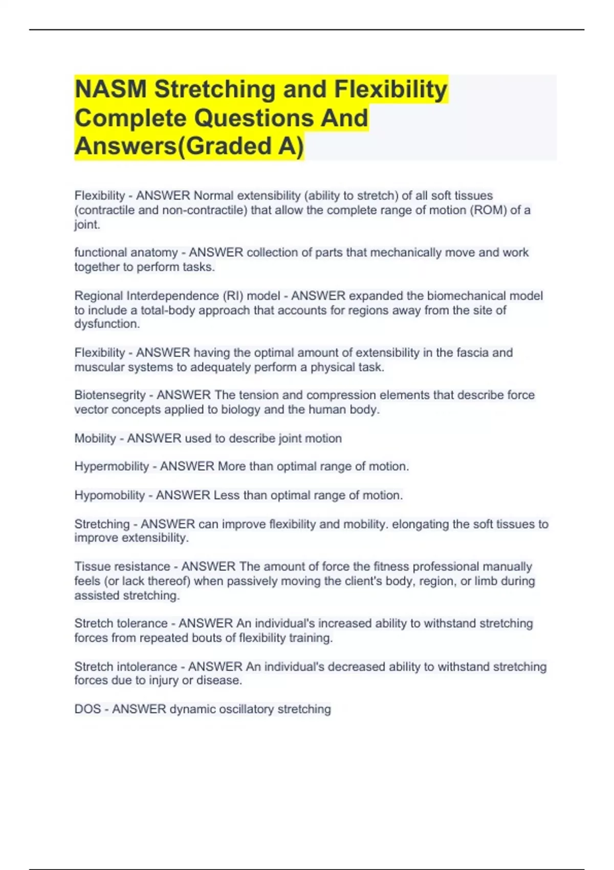 NASM Stretching and Flexibility Complete Questions And Answers(Graded A)NASM Stretching and Flexibility Complete Questions And Answers(Graded A)NASM Stretching and Flexibility Complete Questions And Answers(Graded A)