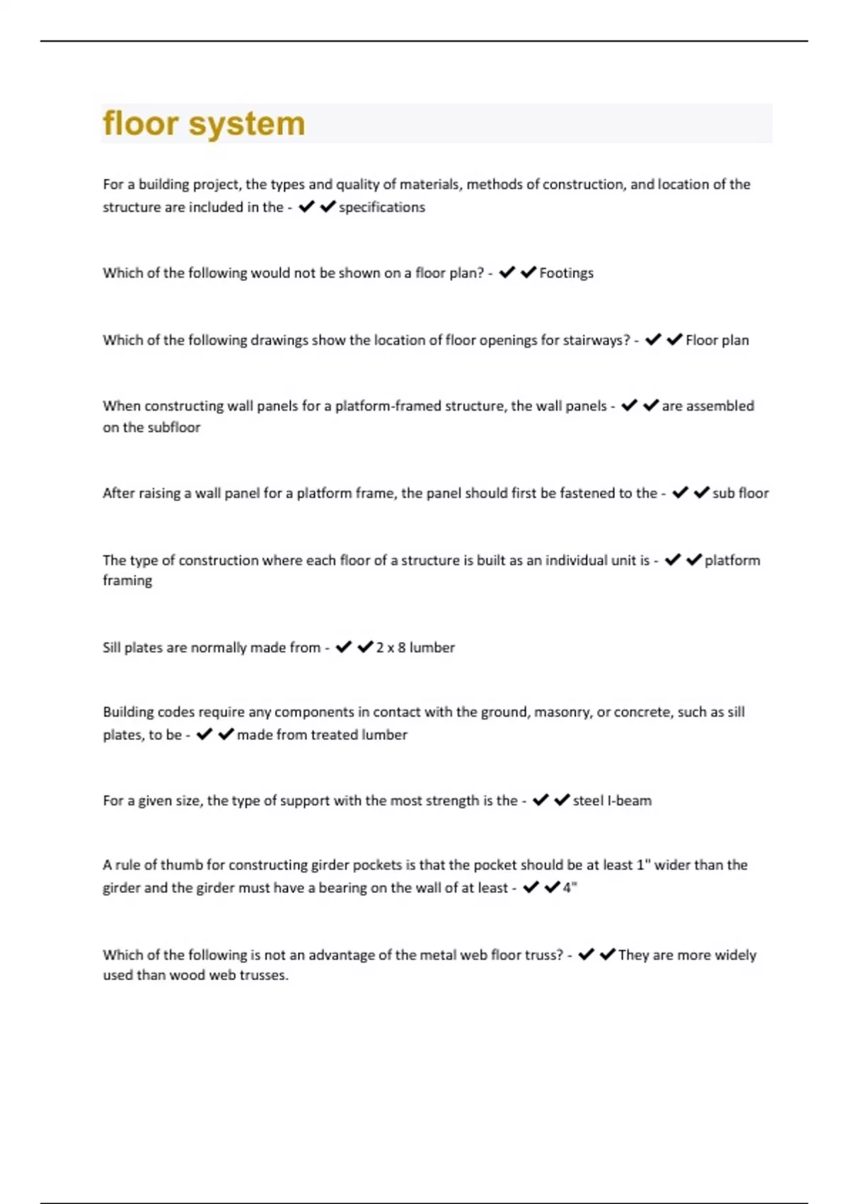 For a building project, the types and quality of materials, methods of construction, and location of the structure are included in the - specifications Which of the following would not be shown on a floor plan? - Footings Which of the following drawings show the location of floor openings for stairways? - Floor plan When constructing wall panels for a platform-framed structure, the wall panels - are assembled on the subfloor After raising a wall panel for a platform frame, the panel should first be fastened to the - sub floor The type of construction where each floor of a structure is built as an individual unit is - platform framing Sill plates are normally made from - 2 x 8 lumber Building codes require any components in contact with the ground, masonry, or concrete, such as sill plates, to be - made from treated lumber For a given size, the type of support with the most strength is the - steel I-beam A rule of thumb for constructing girder pockets is that the pocket should be at least 1" wider than the girder and the girder must have a bearing on the wall of at least - 4" Which of the following is not an advantage of the metal web floor truss? - They are more widely used than wood web trusses.Before starting to install sill plates, - check the foundation for squareness