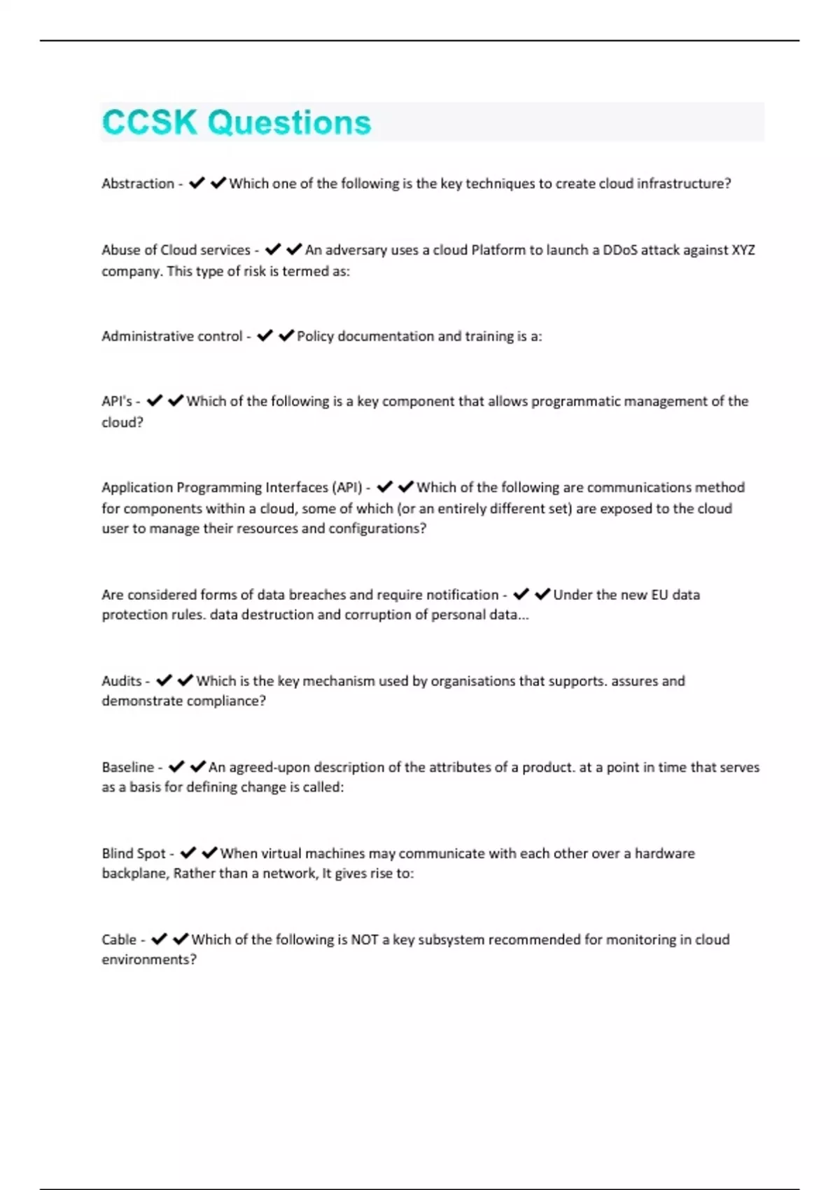 Abstraction - Which one of the following is the key techniques to create cloud infrastructure? Abuse of Cloud services - An adversary uses a cloud Platform to launch a DDoS attack against XYZ company. This type of risk is termed as: Administrative control -Policy documentation and training is a: API's - Which of the following is a key component that allows programmatic management of the cloud? Application Programming Interfaces (API) - Which of the following are communications method for components within a cloud, some of which (or an entirely different set) are exposed to the cloud user to manage their resources and configurations? Are considered forms of data breaches and require notification - Under the new EU data protection rules. data destruction and corruption of personal data... Audits - Which is the key mechanism used by organisations that supports. assures and demonstrate compliance? Baseline - An agreed-upon description of the attributes of a product. at a point in time that serves as a basis for defining change is called: Blind Spot - When virtual machines may communicate with each other over a hardware backplane, Rather than a network, It gives rise to: Cable - Which of the following is NOT a key subsystem recommended for monitoring in cloud environments?Clock - Which one is NOT considered as one of the building blocks of the cloud computing? Cloud computing - What is a type of computing comparable to grid computing that relies on sharing computing resources rather than having local servers or personal devices to handle applications?