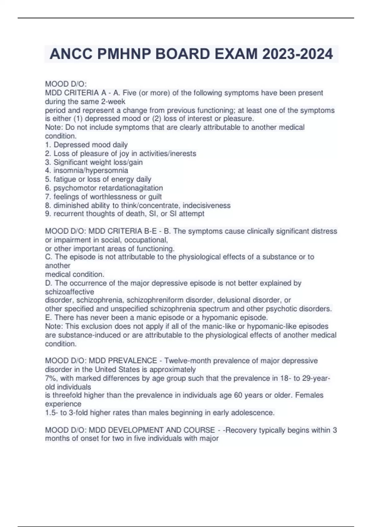 MOOD D/O: MDD CRITERIA A - A. Five (or more) of the following symptoms have been present during the same 2-week period and represent a change from previous functioning; at least one of the symptoms is either (1) depressed mood or (2) loss of interest or pleasure. Note: Do not include symptoms that are clearly attributable to another medical condition. 1. Depressed mood daily 2. Loss of pleasure of joy in activities/inerests 3. Significant weight loss/gain 4. insomnia/hypersomnia 5. fatigue or loss of energy daily 6. psychomotor retardationagitation 7. feelings of worthlessness or guilt 8. diminished ability to think/concentrate, indecisiveness 9. recurrent thoughts of death, SI, or SI attempt MOOD D/O: MDD CRITERIA B-E - B. The symptoms cause clinically significant distress or impairment in social, occupational, or other important areas of functioning. C. The episode is not attributable to the physiological effects of a substance or to another medical condition. D. The occurrence of the major depressive episode is not better explained by schizoaffective disorder, schizophrenia, schizophreniform disorder, delusional disorder, or other specified and unspecified schizophrenia spectrum and other psychotic disorders. E. There has never been a manic episode or a hypomanic episode. Note: This exclusion does not apply if all of the manic-like or hypomanic-like episodes are substance-induced or are attributable to the physiological effects of another medical condition. MOOD D/O: MDD PREVALENCE - Twelve-month prevalence of major depressive disorder in the United States is approximately 7%, with marked differences by age group such that the prevalence in 18- to 29-year-old individuals is threefold higher than the prevalence in individuals age 60 years or older. Females experience 1.5- to 3-fold higher rates than males beginning in early adolescence. MOOD D/O: MDD DEVELOPMENT AND COURSE - -Recovery typically begins within 3 months of onset for two in five individuals with major depression and within 1 year for four in five individuals. -The risk is higher in individuals whose preceding episode was severe, in younger individuals, and in individuals who have already experienced multiple episodes. -The persistence of even mild depressive symptoms during remission is a powerful predictor of recurrence. MOOD D/O: MDD RISK FACTORS - -Neuroticism (negative affectivity) is a well-established risk factor for the onset of major depressive disorder -Adverse childhood experiences, particularly when there are multiple experiences of diverse types, constitute a set of potent risk factors for major depressive disorder. -Stressful life events are well recognized as precipitants of major depressive episodes,but the presence or absence of adverse life events near the onset of episodes does not appear to provide a useful guide to prognosis or treatment selection. -First-degree family members of individuals with major depressive disorder have a risk for major depressive disorder two- to fourfold higher than that of the general population. -Relative risks appear to be higher for early-onset and recurrent forms. Heritability is approximately 40%, and the personality trait neuroticism accounts for a substantial portion of this genetic liability. MOOD D/O: PDD (DYSTHYMIA) DSM5 CRITERIA - Depressed mood for most of the day, for more days than not, as indicated by either subjective account or observation by others, for at least 2 years. Note: In children and adolescents, mood can be irritable and duration must be at least 1 year. B. Presence, while depressed, of two (or more) of the following: 1. Poor appetite or overeating. 2. Insomnia or hypersomnia. 3. Low energy or fatigue. 4. Low self-esteem. 5. Poor concentration or difficulty making decisions. 6. Feelings of hopelessness. C. During the 2-year period (1 year for children or adolescents) of the disturbance, the individual has never been without the symptoms in Criteria A and B for more than 2 months at a time. D. Criteria for a major depressive disorder may be continuously present for 2 years. E. There has never been a manic episode or a hypomanic episode, and criteria have never been met for cyclothymic disorder. F. The disturbance is not better explained by a persistent schizoaffective disorder, schizophrenia, delusional disorder, or other specified or unspecified schizophrenia spectrum and other psychotic disorder. G. The symptoms are not attributable to the physiological effects of a substance (e.g., a drug of abuse, a medication) or another medical condition (e.g. hypothyroidism). H. The symptoms cause clinically significant distress or impairment in social, occupational,