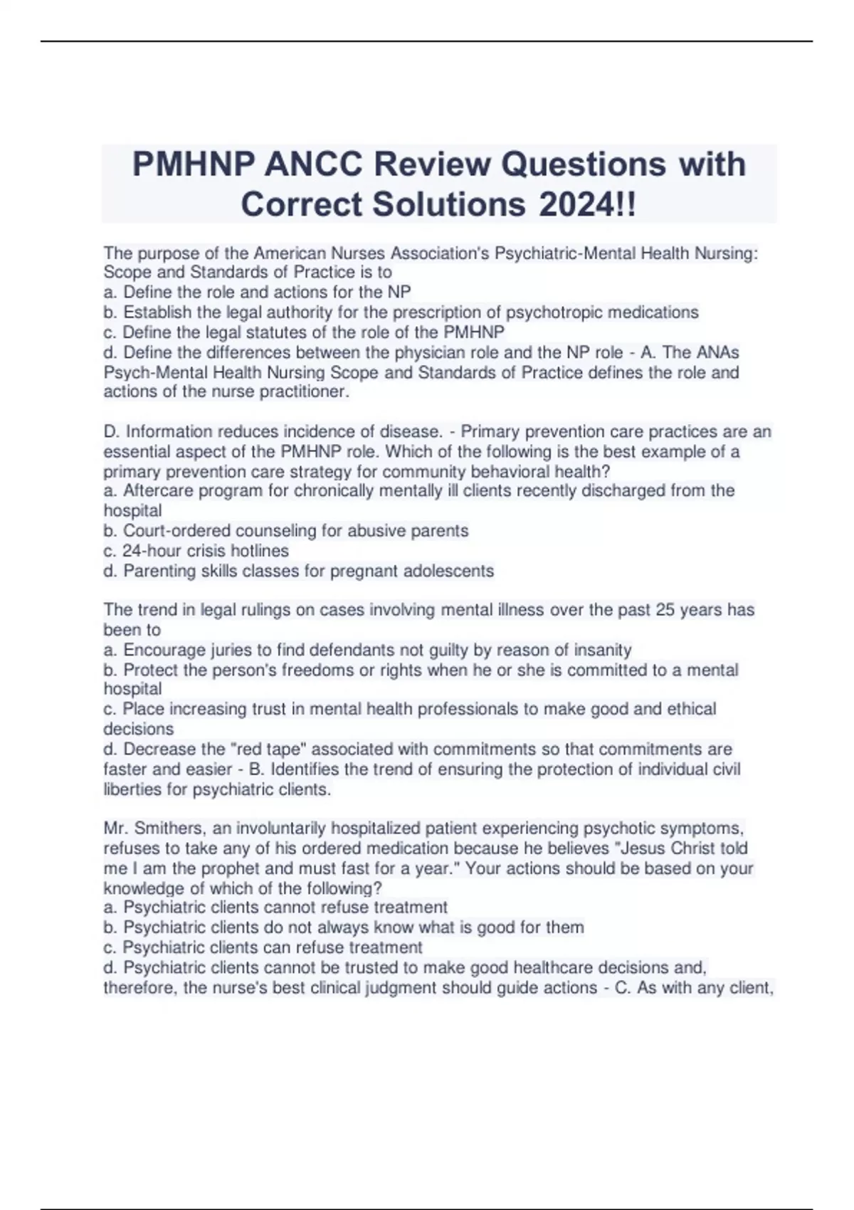 The purpose of the American Nurses Association's Psychiatric-Mental Health Nursing: Scope and Standards of Practice is to a. Define the role and actions for the NP b. Establish the legal authority for the prescription of psychotropic medications c. Define the legal statutes of the role of the PMHNP d. Define the differences between the physician role and the NP role - A. The ANAs Psych-Mental Health Nursing Scope and Standards of Practice defines the role and actions of the nurse practitioner. D. Information reduces incidence of disease. - Primary prevention care practices are an essential aspect of the PMHNP role. Which of the following is the best example of a primary prevention care strategy for community behavioral health? a. Aftercare program for chronically mentally ill clients recently discharged from the hospital b. Court-ordered counseling for abusive parents c. 24-hour crisis hotlines d. Parenting skills classes for pregnant adolescents The trend in legal rulings on cases involving mental illness over the past 25 years has been to a. Encourage juries to find defendants not guilty by reason of insanity b. Protect the person's freedoms or rights when he or she is committed to a mental hospital c. Place increasing trust in mental health professionals to make good and ethical decisions d. Decrease the "red tape" associated with commitments so that commitments are faster and easier - B. Identifies the trend of ensuring the protection of individual civil liberties for psychiatric clients. Mr. Smithers, an involuntarily hospitalized patient experiencing psychotic symptoms, refuses to take any of his ordered medication because he believes "Jesus Christ told me I am the prophet and must fast for a year." Your actions should be based on your knowledge of which of the following? a. Psychiatric clients cannot refuse treatment b. Psychiatric clients do not always know what is good for them c. Psychiatric clients can refuse treatment d. Psychiatric clients cannot be trusted to make good healthcare decisions and, therefore, the nurse's best clinical judgment should guide actions - C. As with any client, psychiatric clients can refuse treatment unless a legal process resulting in involuntary commitment or mandatory court order for treatment has been obtained. Which of the following statements best reflects the difference between the nurse-client (N-C) relationship and a social relationship? a. In the N-C relationship, the primary focus is on the client and the client's needs. b. Goals in the N-C relationship are deliberately left vague and unspoken so that the client can work on any issue. c. In the N-C relationship, the nurse is solely responsible for making the relationship work. d. In the N-C relationship, there is no place for social interaction. - A. Social relationships are mutual interpersonal relationships in which the needs of both parties are addressed. The N-C relationship is most concerned with meeting the needs of the client. A community has an unusually high incidence of depression and drug use among the teenage population. The public health nurses decide to address this problem, in part, by modifying the environment and strengthening the capacities of families to prevent the development of new cases of depression and drug use. What is this is an example of? a. Primary prevention b. Secondary prevention c. Tertiary prevention d. Protective factorial prevention - A. This action focuses on interventions designed to reduce the incidence of new cases of disease. Mrs. Kemp is voluntarily admitted to the hospital. After 24 hours, she states she wishes to leave because "this place can't help me." The best nursing action that reflects the legal right of this client is a. Discharge the client b. Explain that the client cannot leave until you can complete further assessment c. Allow the client to leave but have her sign forms stating she is leaving against medical advice d. Immediately start the paperwork to commit the client and to allow you to treat her against her wishes - B. Almost every state allows for a brief for a period detainment to assess a client for dangerousness to self or others before allowing the client to leave a hospital setting, even if the admission was voluntary. In forming a therapeutic relationship with clients, the PMHNP must consider developing many characteristics that are known to be helpful in relationship-building. Which of the following is an essential part of building a therapeutic relationship? a. Collecting a family history b. Like-mindedness c. Authenticity d. Accuracy in assessment - C. Authenticity. Being genuine, honest, and respectful are essential elements in establishing a working relationship with any client. Like-mindedness is not a part of the therapeutic relationship. Although an important aspect of the PMHNP role, collecting a family history and accuracy in assessment does not in and of itself facilitate relationship building.