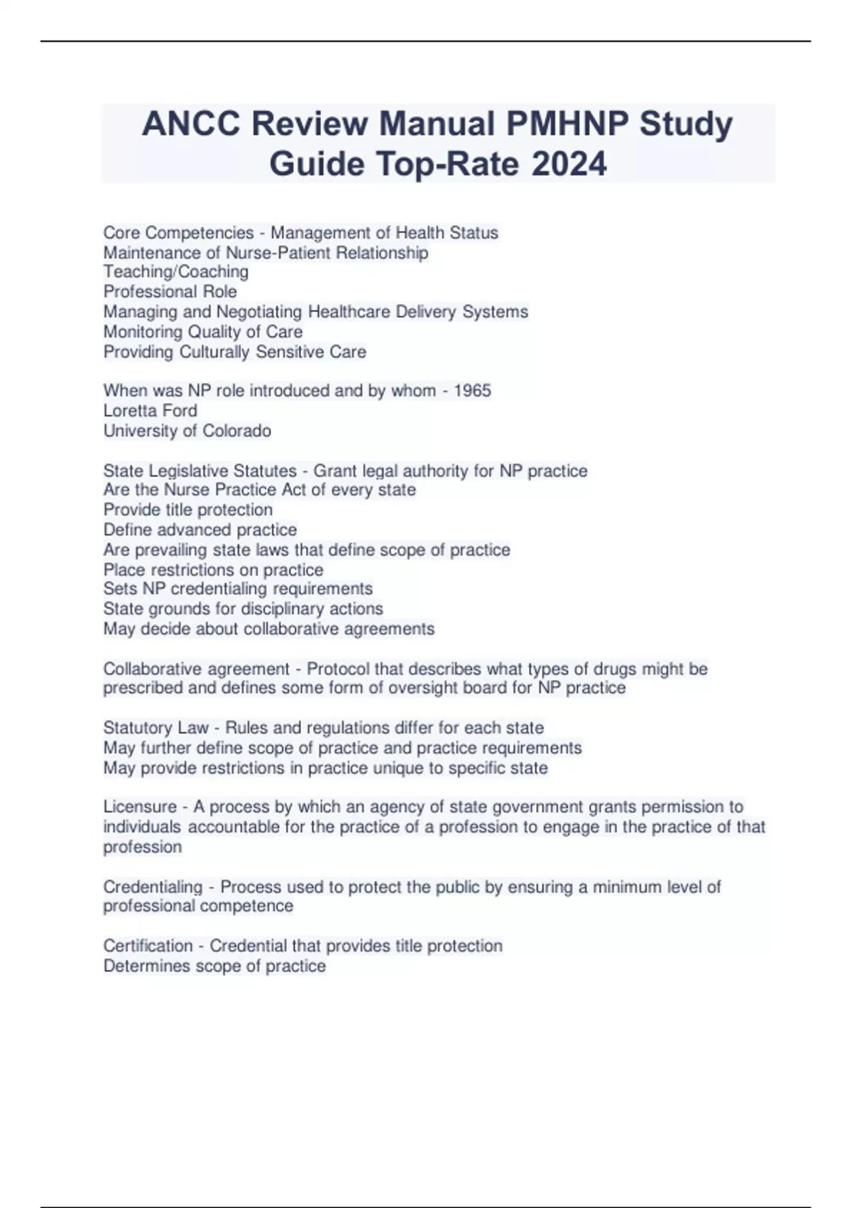 Core Competencies - Management of Health Status Maintenance of Nurse-Patient Relationship Teaching/Coaching Professional Role Managing and Negotiating Healthcare Delivery Systems Monitoring Quality of Care Providing Culturally Sensitive Care When was NP role introduced and by whom - 1965 Loretta Ford University of Colorado State Legislative Statutes - Grant legal authority for NP practice Are the Nurse Practice Act of every state Provide title protection Define advanced practice Are prevailing state laws that define scope of practice Place restrictions on practice Sets NP credentialing requirements State grounds for disciplinary actions May decide about collaborative agreements Collaborative agreement - Protocol that describes what types of drugs might be prescribed and defines some form of oversight board for NP practice Statutory Law - Rules and regulations differ for each state May further define scope of practice and practice requirements May provide restrictions in practice unique to specific state Licensure - A process by which an agency of state government grants permission to individuals accountable for the practice of a profession to engage in the practice of that profession Credentialing - Process used to protect the public by ensuring a minimum level of professional competence Certification - Credential that provides title protection Determines scope of practice Is the process by which a professional organization/association certifies that an individual licensed to practice as a professional has met certain predetermined standards Assures the public that an individual has mastery of a body of knowledge Assures that the individual has acquired the skills necessary to function in a particular specialty ANCC only one for psych Scope of practice - Defines NP roles and actions Identifies competencies assumed to be held by all NPs who function in a particular role Has broad variations from state to state Standards of Practice - Gives authoritative statements regarding the quality and type of practice that should be provided Provides a way to judge the nature of care provided Reflects the expectation for the care that should be provided to patients with various illnesses Reflects professional agreement focused on the minimum levels of acceptable performance Can be used to legally describe the standard of care that must be met by a provider May be precise protocols that must be followed or more general guidelines that recommend actions Four Rights of HIPAA - 1. To be educated about HIPAA privacy protection 2. To have access to their own medical records 3. To request amendment of their health information to which they object 4. To require their permission for disclosure of their personal information HITECH - Incentive payments for sharing specific EHR data Meaningful use incentives Improves outcomes Exceptions to confidentiality - Intent to harm self or others Attorneys involved in litigation When records are released to insurance companies Answering court orders, subpoenas, summons Mandatory reporting of disease and conditions Tarasoff principle: Duty to warn potential victims of imminent danger of homicidal patients Child/elder abuse Justice - Doing what is fair, fairness in all aspects of care Beneficience - Promoting well being and doing good Nonmalfeasance - Doing no harm Fidelity - Being true and loyal Autonomy - Doing for self Veracity - Telling the truth Respect - Treating everyone with equal respect Deontological Theory - An action is judged as good or bad based on the act itself regardless of the consequences Teleological Theory - An action is judged as good or bad based on the consequence or outcome Virtue Ethics - Actions are chosen based on the moral virtues (honesty, courage, compassion, wisdom, gratitude, self respect) or the character of the person making the decision Four elements of negligence to prove malpractice - Duty: NP had a duty to exercise reasonable care when undertaking and providing treatment to the patient Breach of duty: NP violated the applicable standard of care in treating the patient's condition Proximate cause: causal relationship between the breach in the standard of care and the patient's injuries Damages:there are permanent and substantial damages to the patient as a result of the breach in the standard of care Commitment Criteria - Person has a diagnosed psychiatric disorder Person is harmful to self or others as a consequence of the disorder Person is unaware or unwilling to accept the nature and severity of the disorder Treatment is likely to improve functioning Primary Prevention - Aimed at decreasing the incidence (number of new cases) of mental disorders (prevention) Secondary Prevention - Aimed at decreasing prevalence (number of existing cases) of mental disorders (screening) Tertiary Prevention - Aimed at decreasing the disability and severity of a mental disorder (rehab) Ethnicity - Self identified race, tribe, or nation with which a person or group identifies and which greatly influences beliefs and behaviors Schizophrenia accounts for ____% of US homelessness - 15-45%