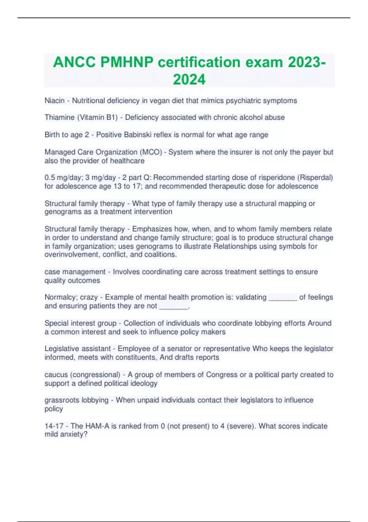 Niacin - Nutritional deficiency in vegan diet that mimics psychiatric symptoms Thiamine (Vitamin B1) - Deficiency associated with chronic alcohol abuse Birth to age 2 - Positive Babinski reflex is normal for what age range Managed Care Organization (MCO) - System where the insurer is not only the payer but also the provider of healthcare 0.5 mg/day; 3 mg/day - 2 part Q: Recommended starting dose of risperidone (Risperdal) for adolescence age 13 to 17; and recommended therapeutic dose for adolescence Structural family therapy - What type of family therapy use a structural mapping or genograms as a treatment intervention Structural family therapy - Emphasizes how, when, and to whom family members relate in order to understand and change family structure; goal is to produce structural change in family organization; uses genograms to illustrate Relationships using symbols for overinvolvement, conflict, and coalitions. case management - Involves coordinating care across treatment settings to ensure quality outcomes Normalcy; crazy - Example of mental health promotion is: validating _______ of feelings and ensuring patients they are not _______. Special interest group - Collection of individuals who coordinate lobbying efforts Around a common interest and seek to influence policy makers Legislative assistant - Employee of a senator or representative Who keeps the legislator informed, meets with constituents, And drafts reports caucus (congressional) - A group of members of Congress or a political party created to support a defined political ideology grassroots lobbying - When unpaid individuals contact their legislators to influence policy 14-17 - The HAM-A is ranked from 0 (not present) to 4 (severe). What scores indicate mild anxiety? 18-24 - The HAM-A is ranked from 0 (not present) to 4 (severe). What scores indicate mild anxiety? 25-30 - The HAM-A is ranked from 0 (not present) to 4 (severe). What scores indicate severe anxiety? sensorimotor stage (birth-2 years) - Piaget's stages of cognitive development when children develop object permanence (things exist even when they cannot be seen). preoperational stage (2-5 years) - Piaget's stages of cognitive development when children tend to be egocentric, think concretely, and develop language and thinking. concrete operational stage (6-11 years) - Piaget's stages of cognitive development when children begin using logic or reasoning about concrete events. formal operational stage (11-19 years) - Piaget's stages of cognitive development when children begin to think abstractly, reason hypothetically, use deductive logic, Infancy (birth to 2 years) - Piaget's sensoriomotor stage of cognitive development when children develop object permanence Early childhood (2-5 years) - Piagets preoperational stage Middle childhood (6-11 years) - Piagets concrete operational stage Adolescence (11-19 years) - Piagets formal operational stage Social phobia - Commonly seen in Japan and Korea taijin kyofusho is a form of what mental illness 4-6 weeks - Time frame for Celexa to have a therapeutic effect 4-6 weeks, 6-12 months - When started on an SSRI may take _____ weeks for effect and should be continued for _____ months to prevent relapse Decrease; increase - Thiazide diuretics such as hydrochlorothiazide [increase/decrease?] lithium clearance, thus [increase/decrease?] the amount of lithium in the body t-test - inferential statistics that assess whether the means of two groups are statistically different from each other Analysis of variance (ANOVA) - inferential statistics that tests the difference among three or more groups