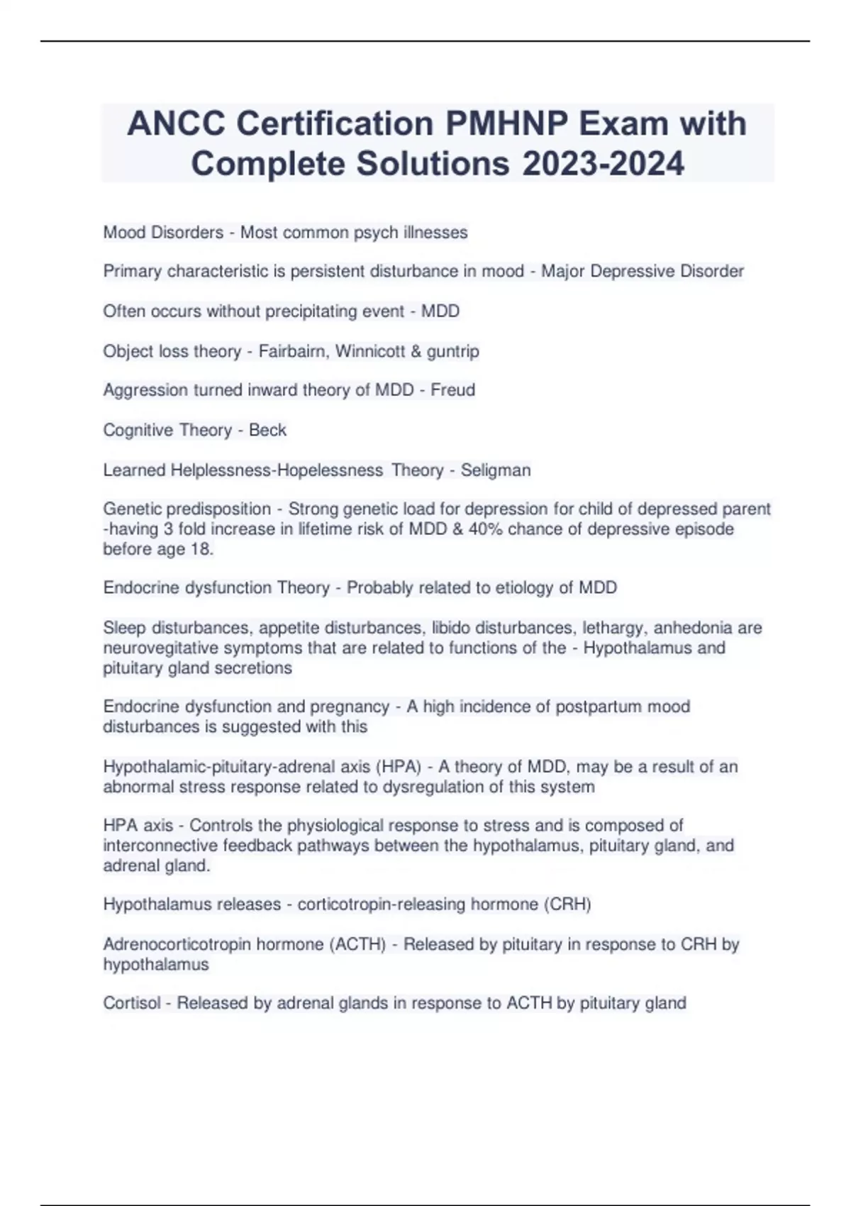 Mood Disorders - Most common psych illnesses Primary characteristic is persistent disturbance in mood - Major Depressive Disorder Often occurs without precipitating event - MDD Object loss theory - Fairbairn, Winnicott & guntrip Aggression turned inward theory of MDD - Freud Cognitive Theory - Beck Learned Helplessness-Hopelessness Theory - Seligman Genetic predisposition - Strong genetic load for depression for child of depressed parent -having 3 fold increase in lifetime risk of MDD & 40% chance of depressive episode before age 18. Endocrine dysfunction Theory - Probably related to etiology of MDD Sleep disturbances, appetite disturbances, libido disturbances, lethargy, anhedonia are neurovegitative symptoms that are related to functions of the - Hypothalamus and pituitary gland secretions Endocrine dysfunction and pregnancy - A high incidence of postpartum mood disturbances is suggested with this Hypothalamic-pituitary-adrenal axis (HPA) - A theory of MDD, may be a result of an abnormal stress response related to dysregulation of this system HPA axis - Controls the physiological response to stress and is composed of interconnective feedback pathways between the hypothalamus, pituitary gland, and adrenal gland. Hypothalamus releases - corticotropin-releasing hormone (CRH) Adrenocorticotropin hormone (ACTH) - Released by pituitary in response to CRH by hypothalamus Cortisol - Released by adrenal glands in response to ACTH by pituitary gland Hyperactivity of the HPA axis - Demonstrated to be present in individuals with MDD. May also have elevated cortisol levels Elevated cortisol levels - Over time damages the CNS by altering neurotransmission and electrical signal conduction. Cortisol over time can cause changes in size and function of brain tissue Dexamethasone suppression test (DST) - Not commonly used in clinical practice for screening of depression as it is too non specific. Hypovolemic hippocampus and hypovolemic prefrontal cortex-limbic striatal regions - Abnormalities demonstrated by neuroimaging in individuals with chronic and severe depression Brain damage, including that from stroke and trauma - Depression is a acommon comorbidity in individuals who have experienced these events What is the Chronobiological theory of MDD - Desynchronization of the circadian rhythms produces the symptom constellation collectively called MDD Circadian rhythms control these biological processes that are frequent problems with depressed individuals - Sleep-rest cycle disturbances * Increased cortisol secretions * REM abnormalities Increased emotional reactivity Frequent waking More intensified dreaming Diurnal variations to circadian-related behaviors Decreased arousal and energy levels Decreased activity patterns * Incidence of MDD - 5% of U.S. population ages 18 and older each year. About 9.9 million Americans Most common psychiatric illness seen in primary care practices; only 50% of people receive treatment - MDD 25% women, 12% men - Risk during reproductive years Risk of MDD is ________ for both genders below puberty and after menopause - equal MDD is (greater) or (lesser) source of morbidity for women than other illnesses. - Greater Fifteen percent (15%) - Of people with MDD will commit suicide