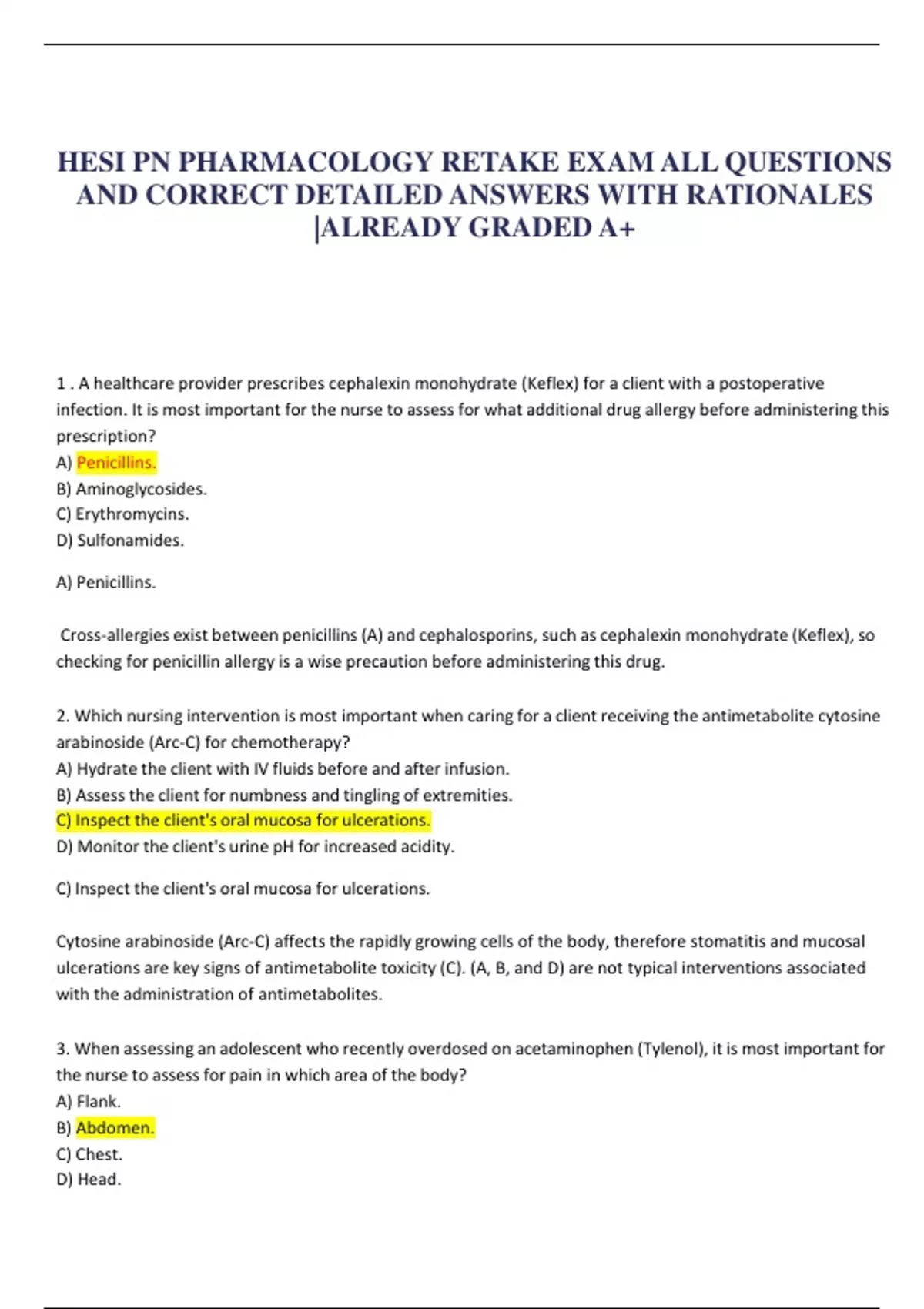 HESI PN PHARMACOLOGY RETAKE EXAM ALL QUESTIONS AND CORRECT DETAILED ANSWERS WITH RATIONALES |ALREADY GRADED A+