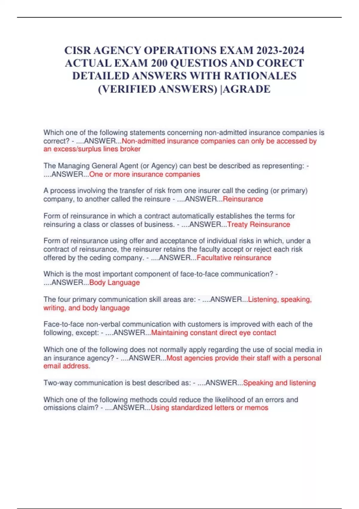 CISR AGENCY OPERATIONS EXAM ACTUAL EXAM 200 QUESTIOS AND CORECT DETAILED ANSWERS WITH RATIONALES (VERIFIED ANSWERS) |AGRADE