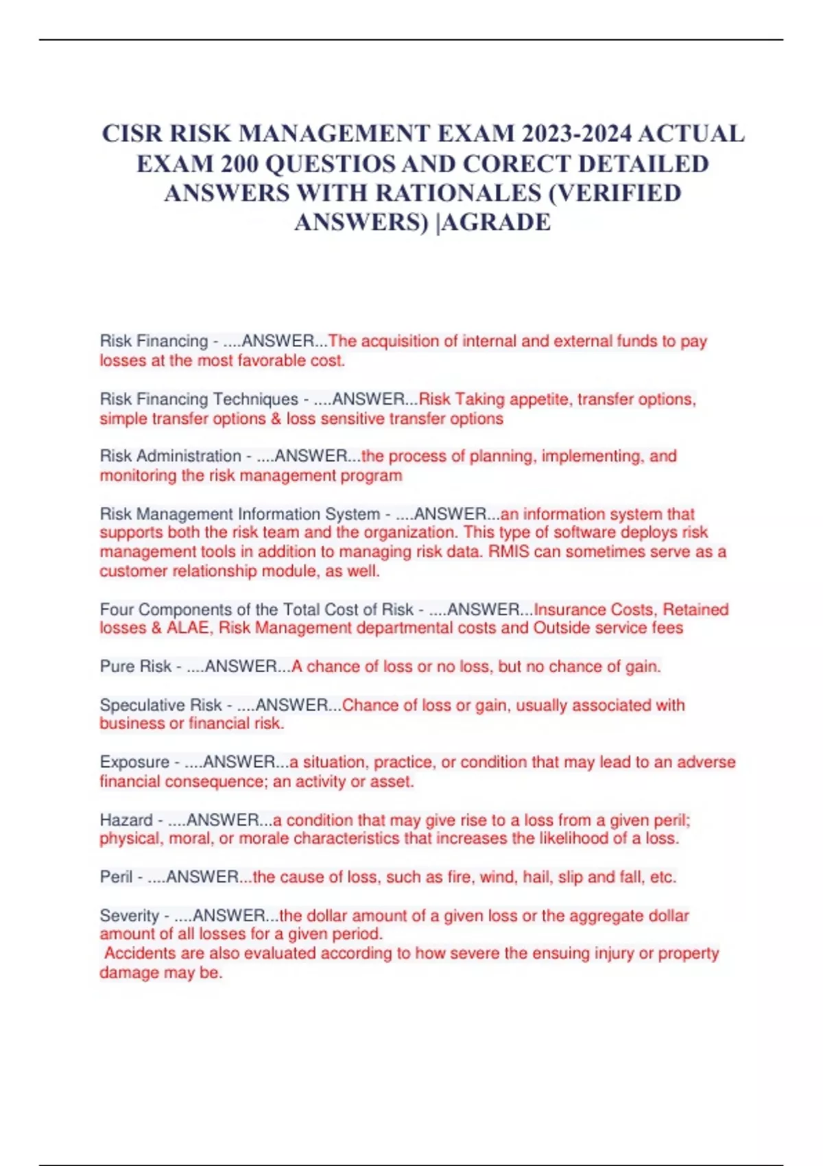 CISR RISK MANAGEME NT EXAM 2023 -2024 ACTUAL EXAM 20 0 QUESTIOS AND CORECT DETAILED ANSWERS WITH RATIONALES (VERIFIED ANSWERS) |AGRADE Risk Financing - ....ANSWER... The acquisition of internal and external funds to pay losses at the most favorable cost. Risk Financing Techniques - ....ANSWER... Risk Taking appetite, transfer options, simple transfer options & loss sensitive transfer options Risk Administration - ....ANSWER... the process of planning, implementing, and monitoring the risk management program Risk Management Information System - ....ANSWER... an information system that supports both the risk team and the organization. This type of software deploys risk management tools in addition to managing risk data. RMIS can sometimes serve as a customer relationship module, as well. Four Components of the Total Cost of Risk - ....ANSWER... Insurance Costs, Retained losses & ALAE, Risk Management departmental costs and Outside service fees Pure Risk - ....ANSWER... A chance of loss or no loss, but no chance of gain. Speculative Risk - ....ANSWER... Chance of loss or gain, usually associated with business or financial risk. Exposure - ....ANSWER... a situation, practice, or condition that may lead to an adverse financial consequence; an activity or asset. Hazard - ....ANSWER... a condition that may give rise to a loss from a given peril; physical, moral, or morale characteristics that increases the likelihood of a loss. Peril - ....ANSWER ...the cause of loss, such as fire, wind, hail, slip and fall, etc. Severity - ....ANSWER... the dollar amount of a given los s or the aggregate dollar amount of all losses for a given period. Accidents are also evaluated according to how severe the ensuing injury or property damage may be. Frequency - ....ANSWER... the number of losses occurring in a given time period. Accidents are evaluated according to how often they might occur. Incident - ....ANSWER... an event that disrupts normal activities and may become a loss (also referred to as a near miss) Accident - ....ANSWER... an unplanned event definite as to time and place that results in injury or damage to a person or property Occurrence - ....ANSWER... an accident with the limitation of time removed (an "accident" that is extended over a period of time rather than a single observable happening) Loss - ....ANSWER ...a reduction in the value of assets. Not all losses become claims Claim - ....ANSWER... a demand for payment or an obligation to pay as a result of a loss Incurred but not repor ted (IBNR) - ....ANSWER... a reserve that must be established for claims that have already occurred but that have not yet been reported Which of the following is not one of the components in the definition of risk? - ....ANSWER... Chance or probability of l oss Certainty concerning a loss Possibility of a variation of outcomes from a given set of circumstances Difference between expected losses and actual losses Loss Trending - ....ANSWER... adjusting historical losses to account for inflationary trends so that the ultimate value is more current or meaningful. Loss trend factors are multiplied by actual historical losses to trend the losses Loss Development - ....ANSWER... the difference between the value of a loss as originally reported and its subse quent evaluation at a later date or at the time of its final disposition Expected Losses - ....ANSWER... Loss projections ("loss pics" or "loss picks") based on probability distributions and statistics, frequently developed using actuarial techniques including trending and development. Avoidance - ....ANSWER... eliminating an activity or exposure which eliminates chance of loss Prevention - ....ANSWER... breaks sequence of events that leads to a loss or that makes the event less likely Reduction - ....ANSWER... reducing the severity or financial impact from unpreventable losses Segregation/Separation/Duplication - ....ANSWER... working primarily to reduce the severity of the loss Transfer (Contractual, Physical or Both) - ....ANSWER... having another party be financially responsible for all or a partial amount of the loss Active Retention - ....ANSWER... planned financial responsibility for the loss. The organization knows in advance that it will be financially responsible should a loss oc cur Passive Retention - ....ANSWER... not planned. It is an organization's unplanned financial responsibility for the loss. Passive retention can be the result of failure of the risk manager or insurance professional to identify the exposure, failure to ac t or forgetting to act. Retention Level - ....ANSWER... the amount of loss that is self -insured. It is usually expressed on a per occurrence basis. It is sometimes referred to as the self -insured retention Frequency - ....ANSWER... A control technique that is designed to prevent a certain type of accident would have the goal of reducing Economic - ....ANSWER ...the risk arising out of an organization's operational, marketplace, financial or entrepreneurial activities Legal - ....ANSWER... the risks inherent in compliance or arising from statutory liability Political - ....ANSWER... the risk associated with legal changes by the governmental interpretations (or reinterpretations) of rules and regulations Social - ....ANSWER... the risks arising from public rel ations, loss of reputation, image or cultural problems Physical - ....ANSWER... risks arising from property, persons, or information Juridicial - ....ANSWER... risks arising from the decision of a judge or jury, or from court or jury attitudes Statutory Liability - ....ANSWER ...holds that a person or company can be held responsible for a certain action or omission because of a related law that is not open to interpretation.