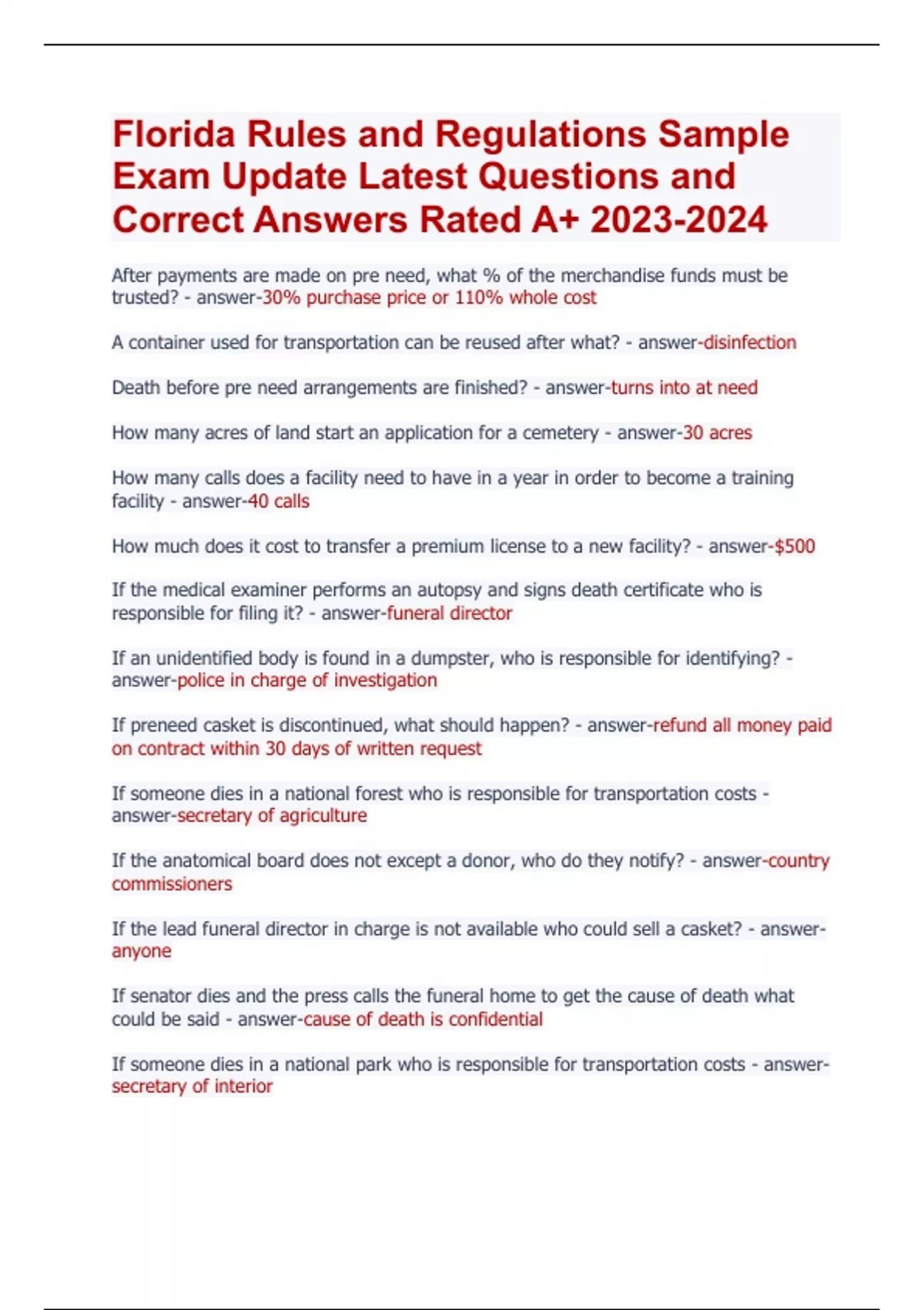 Florida Rules and Regulations Sample Exam Update Latest Questions and Correct Answers Rated A+