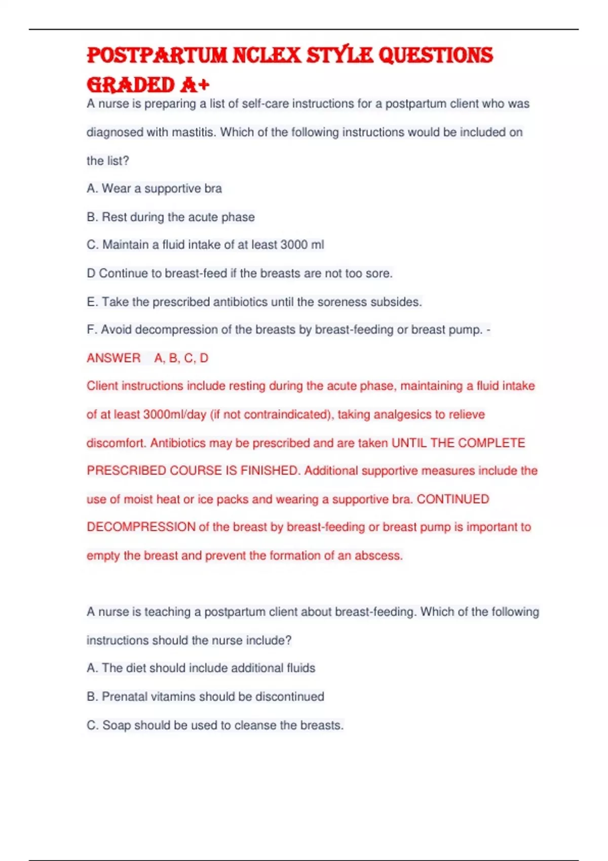 PostPartum NCLEX styLE QuEstioNs gradEd a+ A nurse is preparing a list of self-care instructions for a postpartum client who was diagnosed with mastitis. Which of the following instructions would be included on the list? A. Wear a supportive bra B. Rest during the acute phase C. Maintain a fluid intake of at least 3000 ml D Continue to breast-feed if the breasts are not too sore. E. Take the prescribed antibiotics until the soreness subsides. F. Avoid decompression of the breasts by breast-feeding or breast pump. - ANSWER A, B, C, D Client instructions include resting during the acute phase, maintaining a fluid intake of at least 3000ml/day (if not contraindicated), taking analgesics to relieve discomfort. Antibiotics may be prescribed and are taken UNTIL THE COMPLETE PRESCRIBED COURSE IS FINISHED. Additional supportive measures include the use of moist heat or ice packs and wearing a supportive bra. CONTINUED DECOMPRESSION of the breast by breast-feeding or breast pump is important to empty the breast and prevent the formation of an abscess. A nurse is teaching a postpartum client about breast-feeding. Which of the following instructions should the nurse include? A. The diet should include additional fluids B. Prenatal vitamins should be discontinued C. Soap should be used to cleanse the breasts. PostPartum NCLEX styLE QuEstioNs gradEd a+ D. Birth control measures are unnecessary while breast-feeding. - ANSWER A. A diet for a breast-feeding patient should include additional fluids. Prenatal vitamins should be taken as prescribed and soap should not be used on the breast because it removes natural oils which increases the chance of cracked nipples. Breastfeeding is not a sole method of contraception, so birth control measures should be resumed. A postpartum client is diagnosed with cystitis .The nurse plans for which priority nursing intervention in the care of the client? A. Providing Sitz baths B. Encouraging fluid intake C. Placing ice on the perineum D. Monitoring hemoglobin and hematocrit levels. - ANSWER B. Cystitis is an infection of the bladder. The client should consume 3000ml/day if not contraindicated. Sitz baths and ice would be appropriate interventions for perineal discomfort. H&H would be monitored with hemorrhage. After a precipitous delivery, a nurse notes that the new mother is passive and only touches her newborn infant briefly with her fingertips. The nurse should do which of the following to help the woman process what has happened? A. Encourage the mother to breast-feed soon after birth. B. Support the mother in her reaction to the newborn infant. C. Tell the mother that it is importan