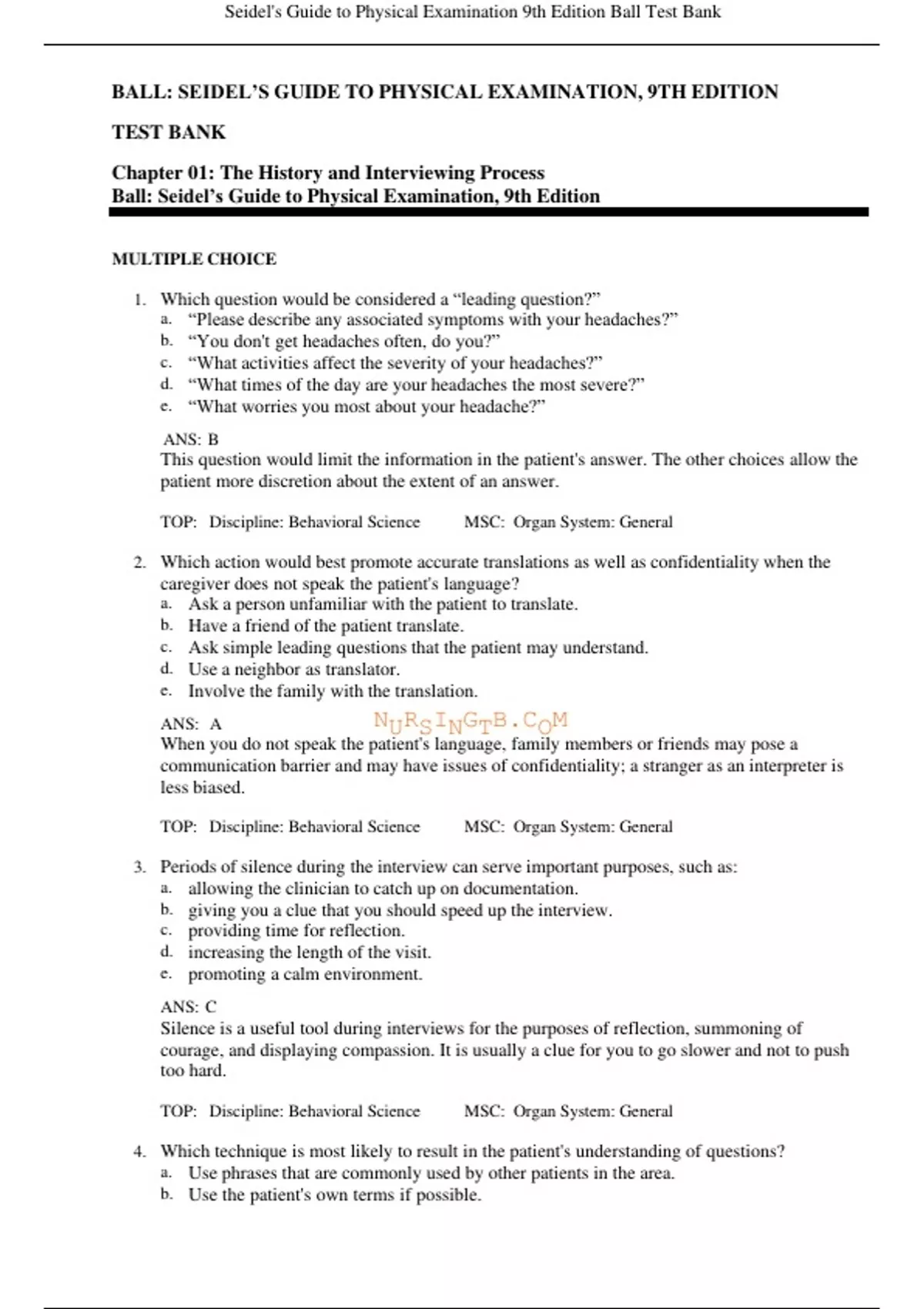 TEST BANK Chapter 01: The History and Interviewing Process Ball: Seidel’s Guide to Physical Examination, 9th Edition 1. Which question would be considered a “leading question?” 2. Which action would best promote accurate translations as well as confidentiality when the caregiver does not speak the patient's language?
