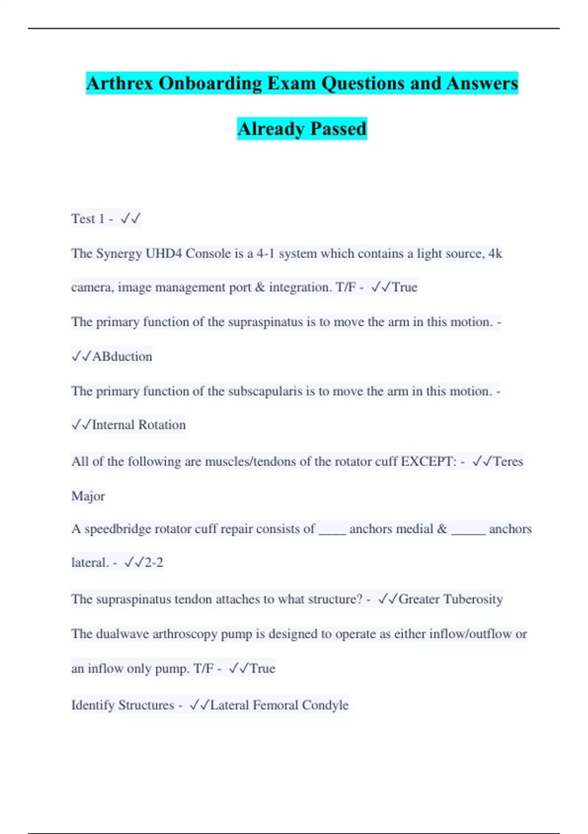 Arthrex Onboarding Exam Questions and Answers Already Passed Test 1 - The Synergy UHD4 Console is a 4-1 system which contains a light source, 4k camera, image management port & integration. T/F - True The primary function of the supraspinatus is to move the arm in this motion. - ABduction The primary function of the subscapularis is to move the arm in this motion. - Internal Rotation All of the following are muscles/tendons of the rotator cuff EXCEPT: - Teres Major A speedbridge rotator cuff repair consists of ____ anchors medial & _____ anchors lateral. - 2-2 The supraspinatus tendon attaches to what structure? - Greater Tuberosity The dualwave arthroscopy pump is designed to operate as either inflow/outflow or an inflow only pump. T/F - True Identify Structures - Lateral Femoral Condyle