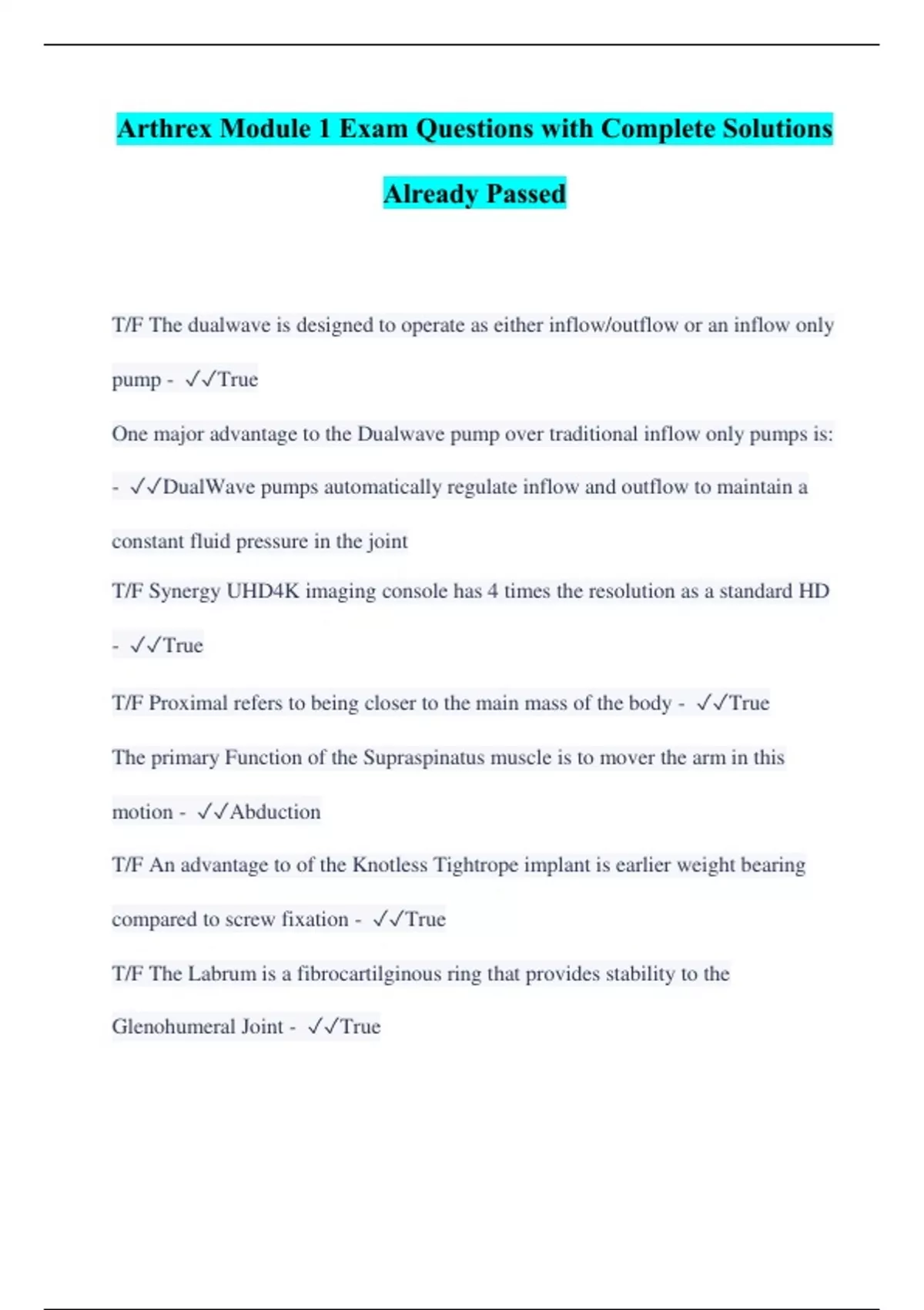 Arthrex Module 1 Exam Questions with Complete Solutions Already Passed T/F The dualwave is designed to operate as either inflow/outflow or an inflow only pump - True One major advantage to the Dualwave pump over traditional inflow only pumps is: - DualWave pumps automatically regulate inflow and outflow to maintain a constant fluid pressure in the joint T/F Synergy UHD4K imaging console has 4 times the resolution as a standard HD - True T/F Proximal refers to being closer to the main mass of the body - True The primary Function of the Supraspinatus muscle is to mover the arm in this motion - Abduction T/F An advantage to of the Knotless Tightrope implant is earlier weight bearing compared to screw fixation - True T/F The Labrum is a fibrocartilginous ring that provides stability to the Glenohumeral Joint - True