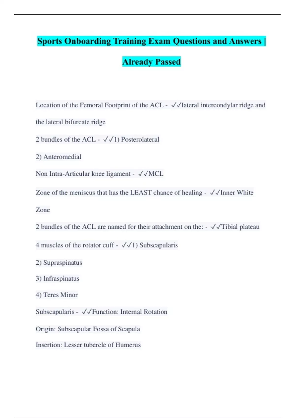 Sports Onboarding Training Exam Questions and Answers | Already Passed Location of the Femoral Footprint of the ACL - lateral intercondylar ridge and the lateral bifurcate ridge 2 bundles of the ACL - 1) Posterolateral 2) Anteromedial Non Intra-Articular knee ligament - MCL Zone of the meniscus that has the LEAST chance of healing - Inner White Zone 2 bundles of the ACL are named for their attachment on the: - Tibial plateau 4 muscles of the rotator cuff - 1) Subscapularis 2) Supraspinatus 3) Infraspinatus 4) Teres Minor Subscapularis - Function: Internal Rotation Origin: Subscapular Fossa of Scapula Insertion: Lesser tubercle of Humerus