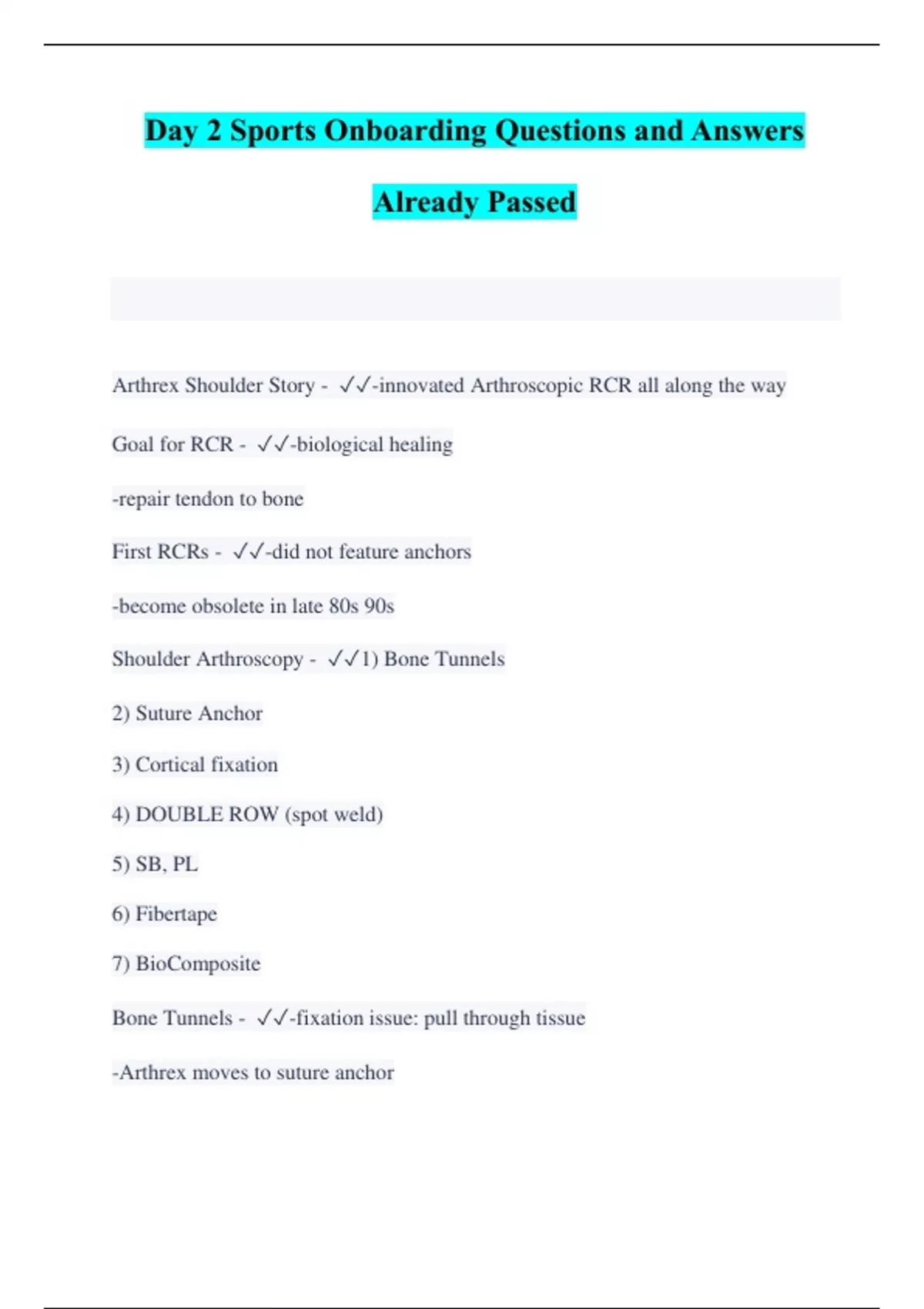 Day 2 Sports Onboarding Questions and Answers Already Passed Arthrex Shoulder Story - -innovated Arthroscopic RCR all along the way Goal for RCR - -biological healing -repair tendon to bone First RCRs - -did not feature anchors -become obsolete in late 80s 90s Shoulder Arthroscopy - 1) Bone Tunnels 2) Suture Anchor 3) Cortical fixation 4) DOUBLE ROW (spot weld) 5) SB, PL 6) Fibertape 7) BioComposite Bone Tunnels - -fixation issue: pull through tissue -Arthrex moves to suture anchor