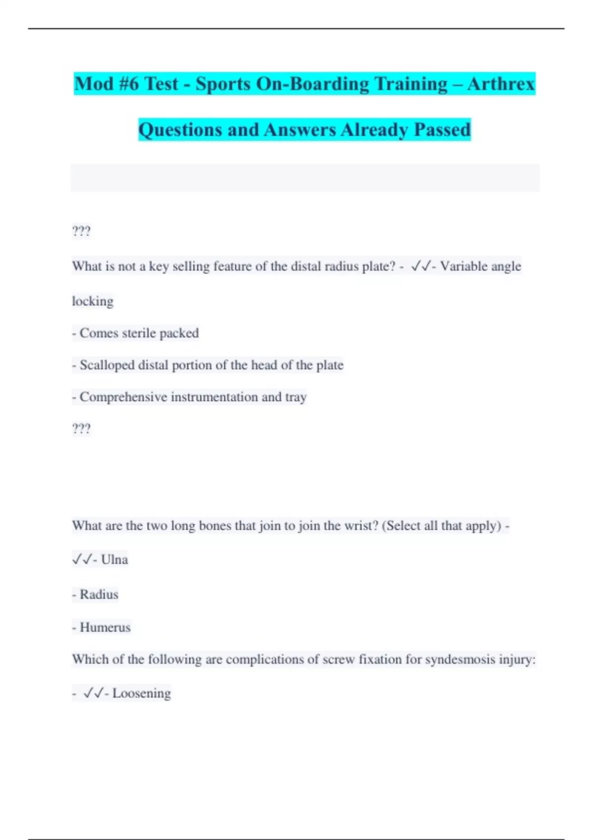 Mod #6 Test - Sports On-Boarding Training – Arthrex Questions and Answers Already Passed ??? What is not a key selling feature of the distal radius plate? - - Variable angle locking - Comes sterile packed - Scalloped distal portion of the head of the plate - Comprehensive instrumentation and tray ??? What are the two long bones that join to join the wrist? (Select all that apply) - - Ulna - Radius - Humerus Which of the following are complications of screw fixation for syndesmosis injury: - - Loosening