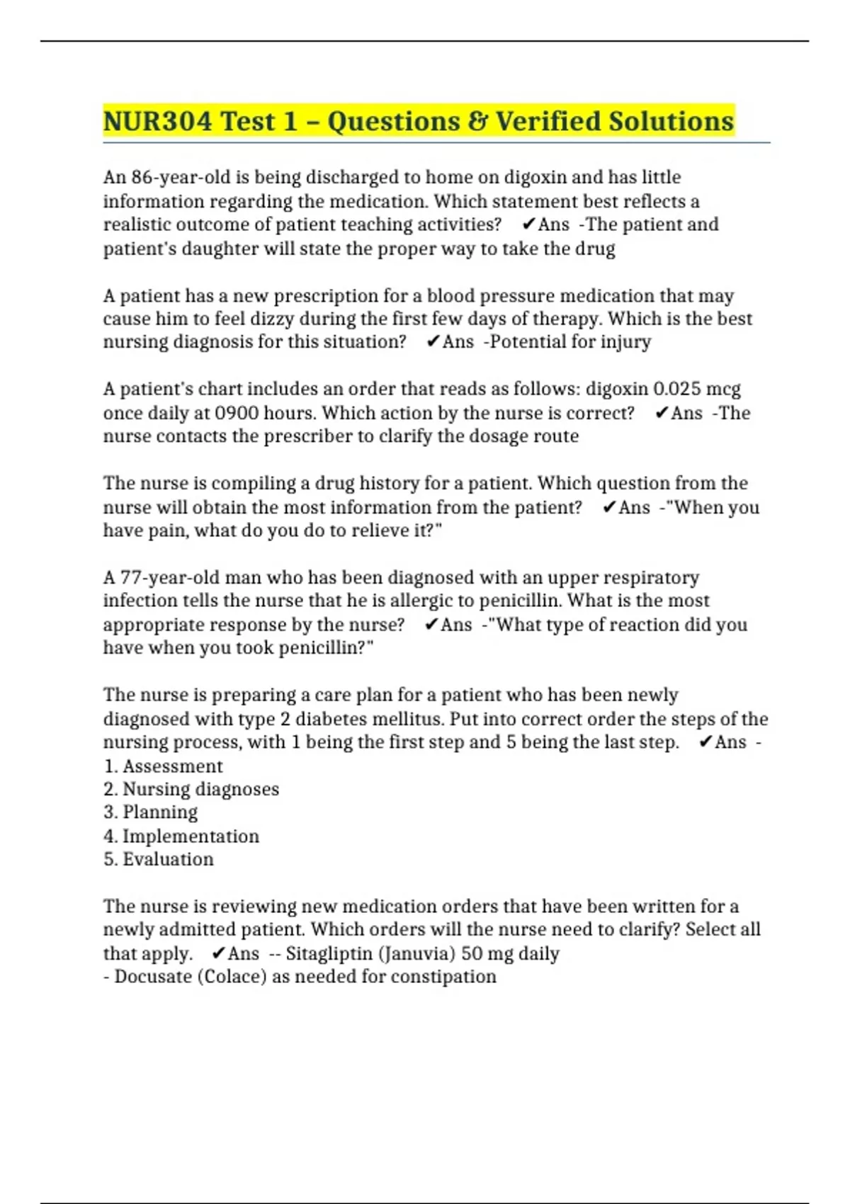NUR304 Test 1 – Questions & Verified Solutions
