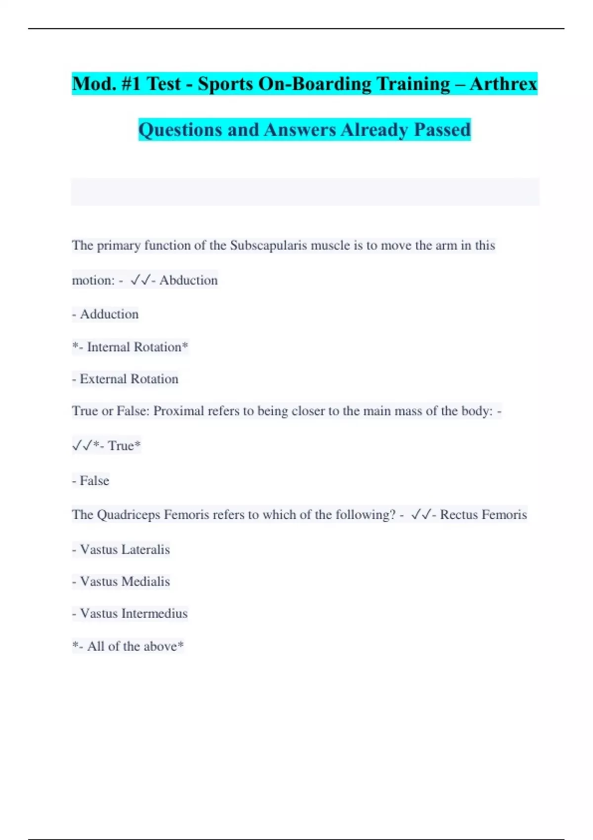 Mod. #1 Test - Sports On-Boarding Training – Arthrex Questions and Answers Already Passed The primary function of the Subscapularis muscle is to move the arm in this motion: - - Abduction - Adduction *- Internal Rotation* - External Rotation True or False: Proximal refers to being closer to the main mass of the body: - *- True* - False The Quadriceps Femoris refers to which of the following? - - Rectus Femoris - Vastus Lateralis - Vastus Medialis - Vastus Intermedius *- All of the above*