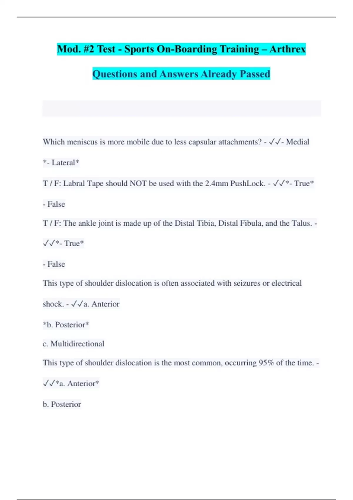 Mod. #2 Test - Sports On-Boarding Training – Arthrex Questions and Answers Already Passed Which meniscus is more mobile due to less capsular attachments? - - Medial *- Lateral* T / F: Labral Tape should NOT be used with the 2.4mm PushLock. - *- True* - False T / F: The ankle joint is made up of the Distal Tibia, Distal Fibula, and the Talus. - *- True* - False This type of shoulder dislocation is often associated with seizures or electrical shock. - a. Anterior *b. Posterior* c. Multidirectional This type of shoulder dislocation is the most common, occurring 95% of the time. - *a. Anterior* b. Posterior