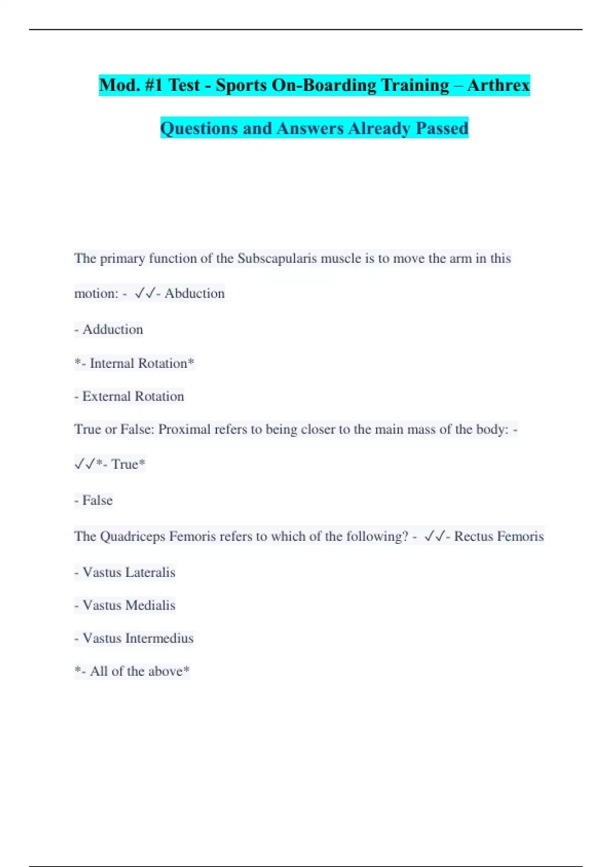 Mod. #1 Test - Sports On-Boarding Training – Arthrex Questions and Answers Already Passed The primary function of the Subscapularis muscle is to move the arm in this motion: - - Abduction - Adduction *- Internal Rotation* - External Rotation True or False: Proximal refers to being closer to the main mass of the body: - *- True* - False The Quadriceps Femoris refers to which of the following? - - Rectus Femoris - Vastus Lateralis - Vastus Medialis - Vastus Intermedius *- All of the above*