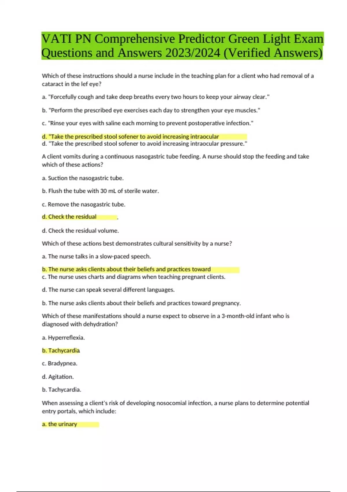 VATI PN Comprehensive Predictor Green Light Exam Questions and Answers 2023/2024 (100% Verified). Which of these instructions should a nurse include in the teaching plan for a client who had removal of a cataract in the lef eye? a. "Forcefully cough and take deep breaths every two hours to keep your airway clear." b. "Perform the prescribed eye exercises each day to strengthen your eye muscles." c. "Rinse your eyes with saline each morning to prevent postoperative infection." d. "Take the prescribed stool sofener to avoid increasing intraocular pressure." A client vomits during a continuous nasogastric tube feeding. A nurse should stop the feeding and take which of these actions? a. Suction the nasogastric tube. b. Flush the tube with 30 mL of sterile water. c. Remove the nasogastric tube. . d. Check the residual volume. Which of these actions best demonstrates cultural sensitivity by a nurse? a. The nurse talks in a slow-paced speech. c. The nurse uses charts and diagrams when teaching pregnant clients. d. The nurse can speak several different languages. b. The nurse asks clients about their beliefs and practices toward pregnancy. Which of these manifestations should a nurse expect to observe in a 3-month-old infant who is diagnosed with dehydration? a. Hyperreflexia. . c. Bradypnea. d. Agitation. b. Tachycardia. When assessing a client's risk of developing nosocomial infection, a nurse plans to determine potential entry portals, which include: d. "Take the prescribed stool sofener to avoid increasing intraocular b. The nurse asks clients about their beliefs and practices toward a. the urinary b. Tachycardia d. Check the residual VATI PN Comprehensive Predictor Green Light Exam Questions and Answers 2023/2024 (Verified Answers) b. vomitus. c. contaminated water. d. sexual intercourse. a. the urinary meatus. A client who is on the inpatient psychiatric unit has a history of violence. Which of these actions should a nurse take if the client is agitated? b. Lock the client in a secluded room. c. Ask the other clients to give feedback regarding the client's behavior. d. Ignore the client's inappropriate behavior. a. Encourage the client to verbalize feelings. Which of these measures should a nurse include when planning care for a school-aged child during a sickle cell crisis episode? a. Monitoring for signs of bleeding. c. Administering cool sponge baths to reduce fevers. d. Offering a high calorie diet. b. Providing pain relief. Which of these instructions should a nurse include in the plan of care for a 32-week gestation client who had an amniocentesis today? a. "Drink at least six glasses of fluids during the next six hours afer the test." c. "Don't be concerned if you have some vaginal spotting in the next 12 hours." d. "When you get home, stay on bed-rest for the next 48 hours." b. "Call the clinic if you experience any abdominal cramps." An adolescent has a nursing diagnosis of fatigue related to inadequate intake of iron-rich foods. Selection of which of these lunches by the client indicates a correct understanding of foods high in iron content? a. Peanut butter and jam sandwich. b. Chicken nuggets with rice. c. Tuna salad sandwich. a. Encourage the client to verbalize b. Providing pain relief. b. "Call the clinic if you experience any abdominal d. Beefburger with d. Beefburger with cheese. A client has been admitted with acute pancreatitis. Which of these laboratory test results supports this diagnosis? a. Elevated serum potassium level. . c. Elevated serum sodium level. d. Elevated serum creatinine level. b. Elevated serum amylase level. Which of these manifestations, if assessed in a client who is two-hours postoperative afer abdominal surgery, should a nurse report immediately? b. Respiratory rate of 12/minute and urine dribbling. c. Blood pressure of 100/60 mm Hg and wound discomfort. d. Urine output of 100 mL/hr and flushed skin. a. Vomiting and a pulse rate of 106/minute. Which of these observations of a student nurse's behavior while interacting with a client who is crying indicates a correct understanding of therapeutic communication? a. The student maintains continuous eye contact with the client. b. The student places one arm around the client's shoulder? d. The student leaves the room to provide privacy for the client. c. The student sits quietly next to the client. Which of these actions should a nurse take initially if a client who is diagnosed with diabetes mellitus develops tremors and ataxia? . b. Administer a concentrated form glucose to the client. c. Administer a prn dose of insulin. d. Measure the client's urine for ketones. a. Measure the client's blood sugar level. a. Vomiting and a pulse rate of c. The student sits quietly next to the a. Measure the client's blood sugar b. Elevated serum amylase An elderly client is at increased risk of developing drug toxicity to prescribed medications due to declining hepatic and renal functioning. Which of these strategies should a nurse plan to decrease this risk? b. Limiting the client's oral fluid intake. c. Administering the medications with meals. d. Encouraging the client to void every three to four hours. a. Increasing the time interval between medication doses. A client has persistent paranoid delusions that the food on the unit is poisoned. Which of these measures should a nurse include in the client's care plan? a. Explaining that staff does not poison clients. b. Focusing on how the hospital staff helps clients. d. Telling the client that not eating the food that is served will result in privilege restrictions. c. Allowing the client to eat food from sealed containers. Thrombophlebitis is a complication that may result due to surgery. Which of these actions should a nurse take in the operating room to prevent this complication from occurring? a. Gatch the knee of the bed. b. Administer anticoagulants preoperatively. d. Maintain the legs in a dependent position. c. Apply sequential compression devices. When discus