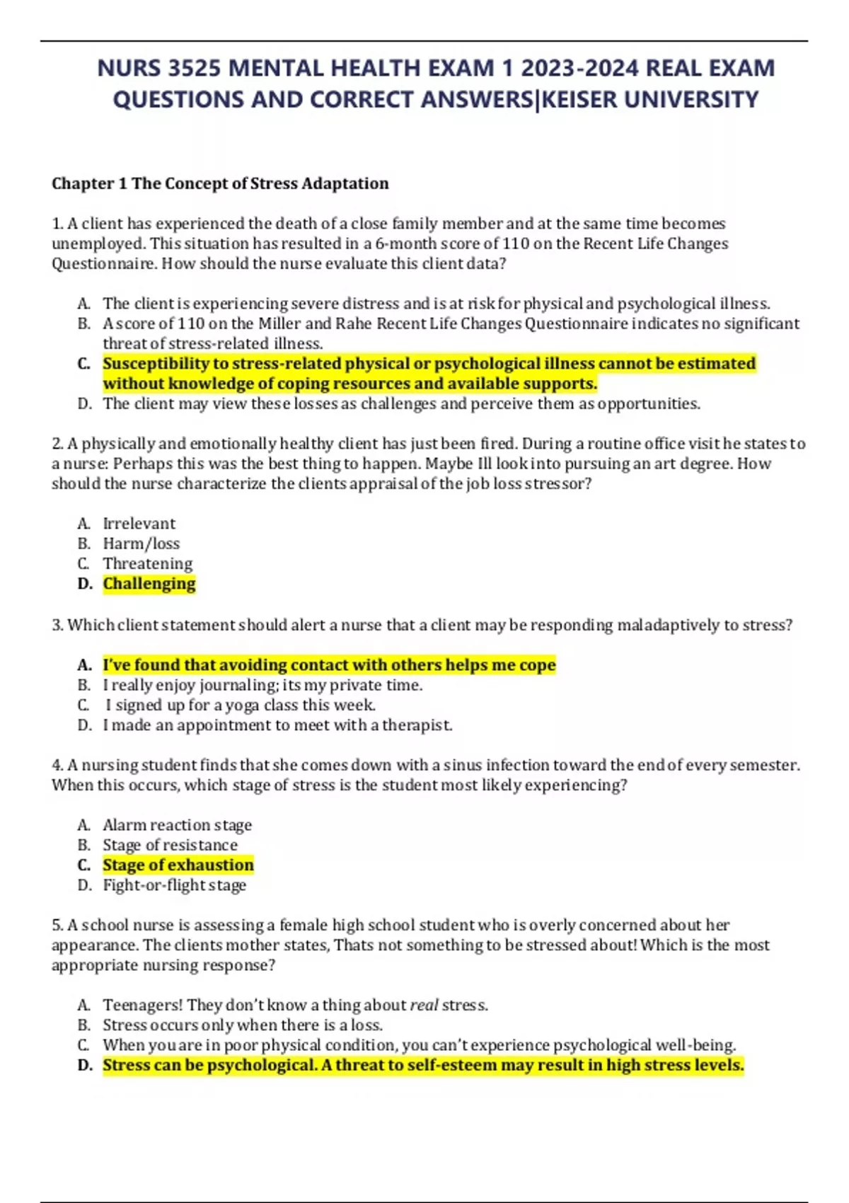 NURS 3525 MENTAL HEALTH EXAM REAL EXAM QUESTIONS AND CORRECT ANSWERS|KEISER UNIVERSITY