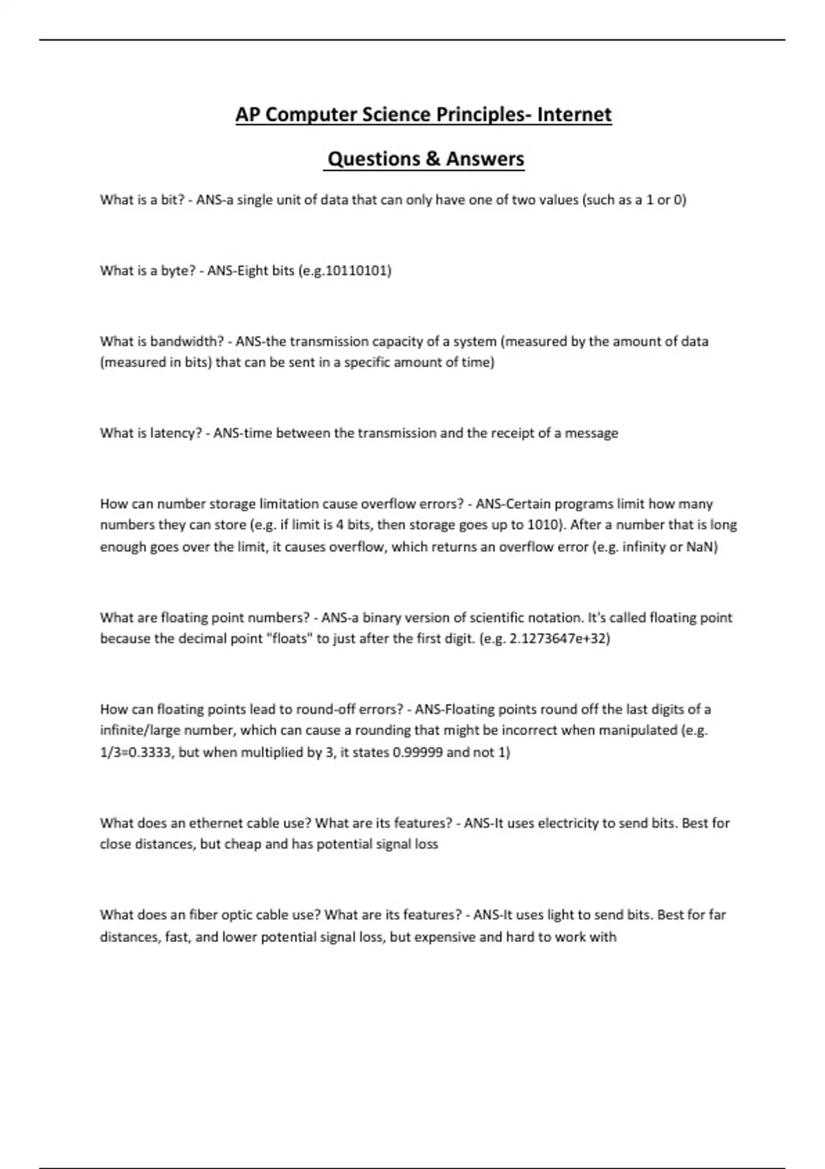 AP Computer Science Principles- Internet Questions & Answers What is a bit? - ANS-a single unit of data that can only have one of two values (such as a 1 or 0) What is a byte? - ANS-Eight bits (e.g.) What is bandwidth? - ANS-the transmission capacity of a system (measured by the amount of data (measured in bits) that can be sent in a specific amount of time) What is latency? - ANS-time between the transmission and the receipt of a message How can number storage limitation cause overflow errors? - ANS-Certain programs limit how many numbers they can store (e.g. if limit is 4 bits, then storage goes up to 1010). After a number that is long enough goes over the limit, it causes overflow, which returns an overflow error (e.g. infinity or NaN) What are floating point numbers? - ANS-a binary version of scientific notation. It's called floating point because the decimal point "floats" to just after the first digit. (e.g. 2.1273647e+32) How can floating points lead to round-off errors? - ANS-Floating points round off the last digits of a infinite/large number, which can cause a rounding that might be incorrect when manipulated (e.g. 1/3=0.3333, but when multiplied by 3, it states 0.99999 and not 1) What does an ethernet cable use? What are its features? - ANS-It uses electricity to send bits. Best for close distances, but cheap and has potential signal loss What does an fiber optic cable use? What are its features? - ANS-It uses light to send bits. Best for far distances, fast, and lower potential signal loss, but expensive and hard to work with CONTINUES...