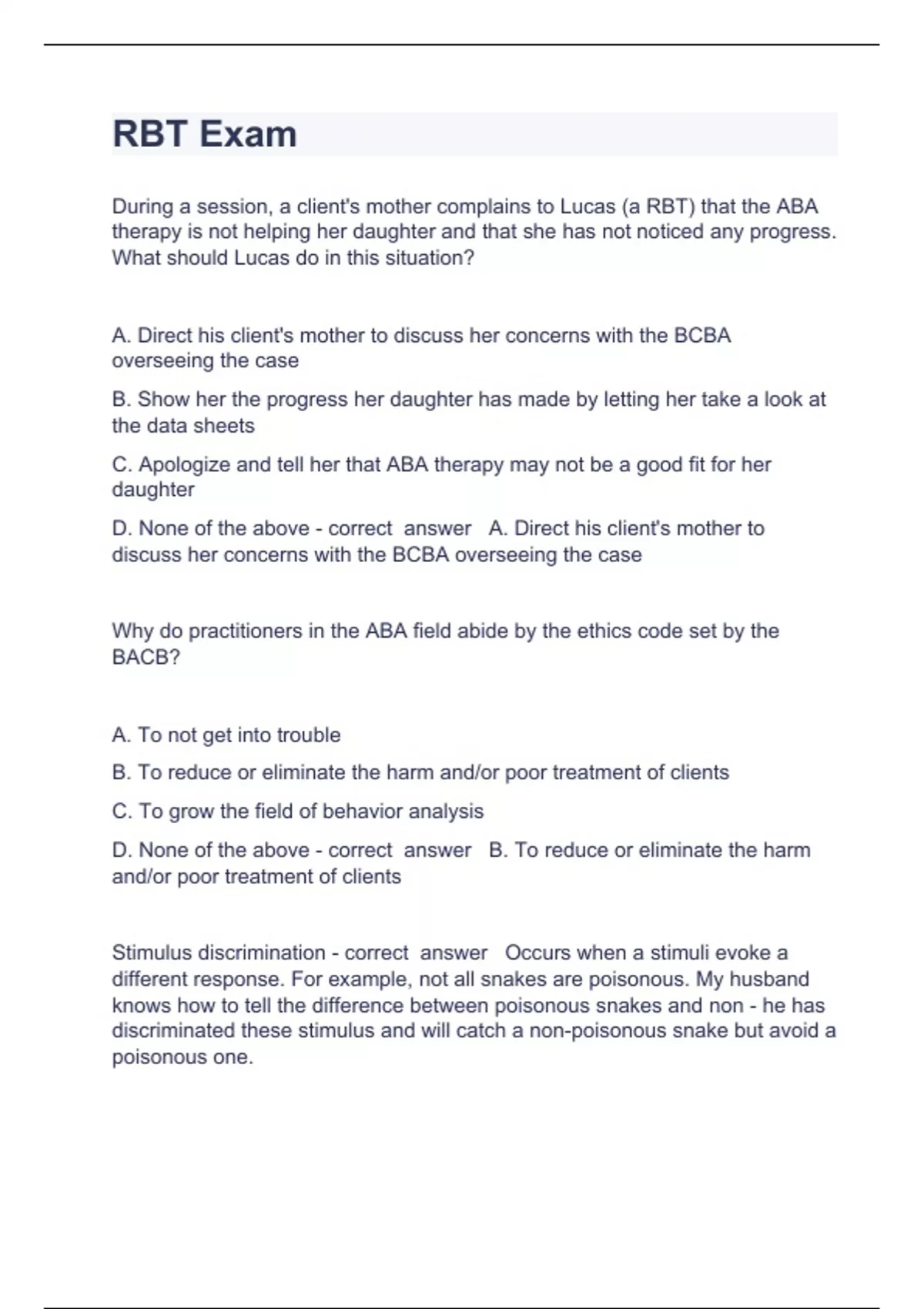 RBT Exam Question and answers already passed 2023/2024During a session, a client's mother complains to Lucas (a RBT) that the ABA therapy is not helping her daughter and that she has not noticed any progress. What should Lucas do in this situation? A. Direct his client's mother to discuss her concerns with the BCBA overseeing the case B. Show her the progress her daughter has made by letting her take a look at the data sheets C. Apologize and tell her that ABA therapy may not be a good fit for her daughter D. None of the above - correct answer A. Direct his client's mother to discuss her concerns with the BCBA overseeing the case Why do practitioners in the ABA field abide by the ethics code set by the BACB?