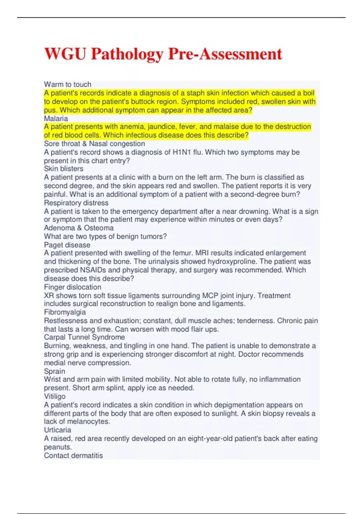 A patient presents at a clinic with a burn on the left arm. The burn is classified as second degree, and the skin appears red and swollen. The patient reports it is very painful. What is an additional symptom of a patient with a second-degree burn? Respiratory distress A patient is taken to the emergency department after a near drowning. What is a sign or symptom that the patient may experience within minutes or even days? Adenoma & Osteoma What are two types of benign tumors? Paget disease A patient presented with swelling of the femur. MRI results indicated enlargement and thickening of the bone. The urinalysis showed hydroxyproline. The patient was prescribed NSAIDs and physical therapy, and surgery was recommended. Which disease does this describe? Finger dislocation XR shows torn soft tissue ligaments surrounding MCP joint injury. Treatment includes surgical reconstruction to realign bone and ligaments. Fibromyalgia Restlessness and exhaustion; constant, dull muscle aches; tenderness. Chronic pain that lasts a long time. Can worsen with mood flair ups. Carpal Tunnel Syndrome Burning, weakness, and tingling in one hand. The patient is unable to demonstrate a strong grip and is experiencing stronger discomfort at night. Doctor recommends medial nerve compression. Sprain Wrist and arm pain with limited mobility. Not able to rotate fully, no inflammation present. Short arm splint, apply ice as needed. Vitiligo A patient's record indicates a skin condition in which depigmentation appears on different parts of the body that are often exposed to sunlight. A skin biopsy reveals a lack of melanocytes. Urticaria A raised, red area recently developed on an eight-year-old patient's back after eating peanuts. Contact dermatitis