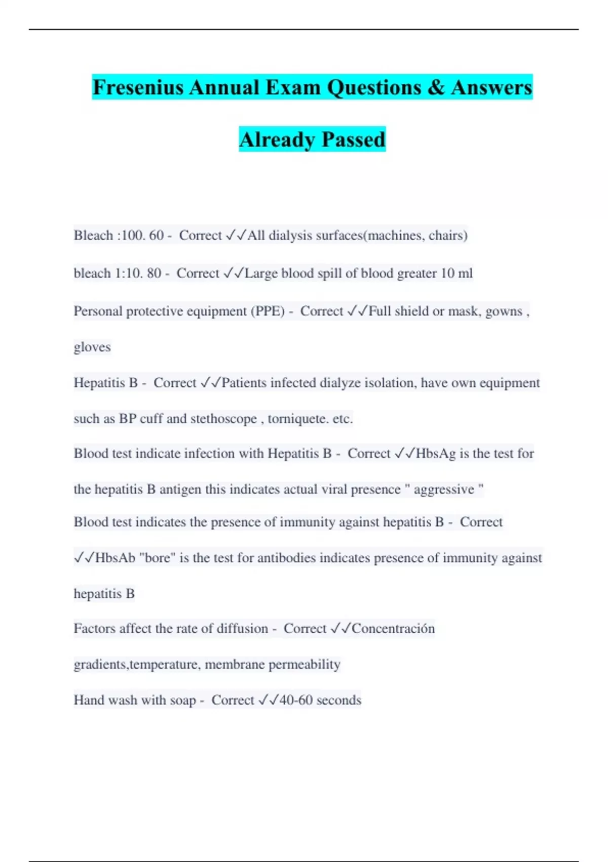 Fresenius Annual Exam Questions & Answers Already Passed Bleach :100. 60 - Correct All dialysis surfaces(machines, chairs) bleach 1:10. 80 - Correct Large blood spill of blood greater 10 ml Personal protective equipment (PPE) - Correct Full shield or mask, gowns , gloves Hepatitis B - Correct Patients infected dialyze isolation, have own equipment such as BP cuff and stethoscope , torniquete. etc. Blood test indicate infection with Hepatitis B - Correct HbsAg is the test for the hepatitis B antigen this indicates actual viral presence " aggressive " Blood test indicates the presence of immunity against hepatitis B - Correct HbsAb "bore" is the test for antibodies indicates presence of immunity against hepatitis B Factors affect the rate of diffusion - Correct Concentración gradients,temperature, membrane permeability Hand wash with soap - Correct 40-60 seconds
