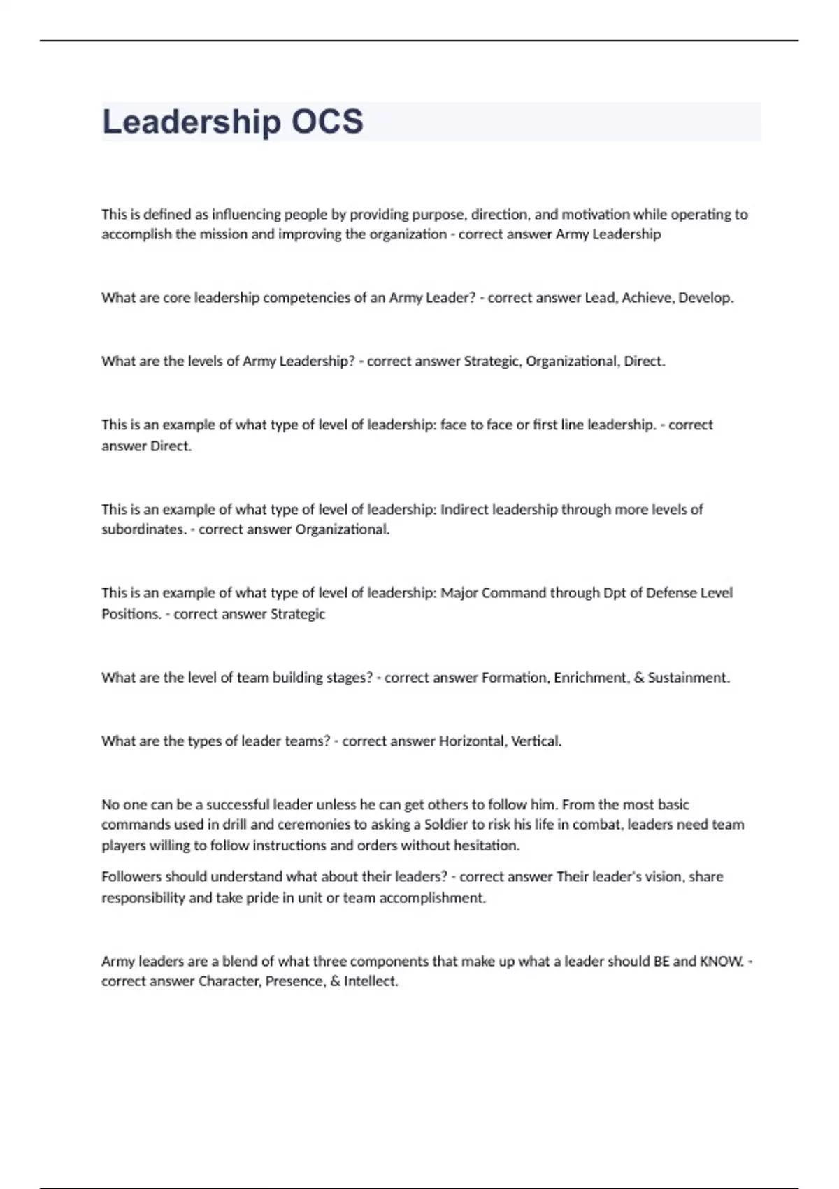 Leadership OCS This is defined as influencing people by providing purpose, direction, and motivation while operating to accomplish the mission and improving the organization - correct answer Army Leadership What are core leadership competencies of an Army Leader? - correct answer Lead, Achieve, Develop. What are the levels of Army Leadership? - correct answer Strategic, Organizational, Direct. This is an example of what type of level of leadership: face to face or first line leadership. - correct answer Direct. This is an example of what type of level of leadership: Indirect leadership through more levels of subordinates. - correct answer Organizational. This is an example of what type of level of leadership: Major Command through Dpt of Defense Level Positions. - correct answer Strategic What are the level of team building stages? - correct answer Formation, Enrichment, & Sustainment. What are the types of leader teams? - correct answer Horizontal, Vertical. No one can be a successful leader unless he can get others to follow him. From the most basic commands used in drill and ceremonies to asking a Soldier to risk his life in combat, leaders need team players willing to follow instructions and orders without hesitation. Followers should understand what about their leaders? - correct answer Their leader's vision, share responsibility and take pride in unit or team accomplishment. Army leaders are a blend of what three components that make up what a leader should BE and KNOW. - correct answer Character, Presence, & Intellect. What does it take to be a leader of character? - correct answer Values...empathy...and adopting the Warrior Ethos mindset. Soldiers and leaders must be _____, _______, and ______ fit to prepare for the hardships of deployments and combat - correct answer physically, morally, and spiritualy This is an example of what character of leadership? Possesses military bearing, Physically and Spiritually Fit, Confident, Resilent. - correct answer Presence This is an example of what character of leadership? Agility, Judgement, Innovation, Interpersonal Tact. - correct answer Intellect This is an example of what character of leadership? See things from anothers point of view, Share hardships with subordinates, Provide Soldiers with reasonable comfort and rest. - correct answer Empathy. Domain knowledge is? - correct answer Knowing all areas to do your job. In this case this includes tactical as well as technical knowledge. What are some examples of Domain Knowledge? - correct answer Tactical, Technical, Cultural, Geo-Political. This is a metaphor for the type of multi-skilled, agile, competent leader needed to face the challenges of our current security environment. - correct answer Pentathlete. Competency Based Leadership Model has core leader competencies that fall into three main categories derived from the basic parts of our leadership definition: What are they? - correct answer Leads (influencing, providing purpose, direction, and motivation) Develops (improving the organization) Achieves (operating to accomplish the mission)