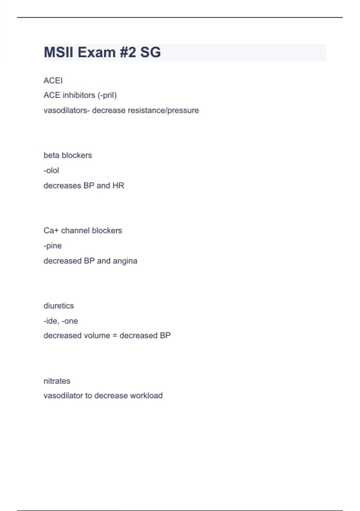 MSII Exam Questions with complete solution 2023/2024ACEI ACE inhibitors (-pril) vasodilators- decrease resistance/pressure beta blockers -olol decreases BP and HR Ca+ channel blockers -pine decreased BP and angina diuretics -ide, -one decreased volume = decreased BP nitrates vasodilator to decrease workload