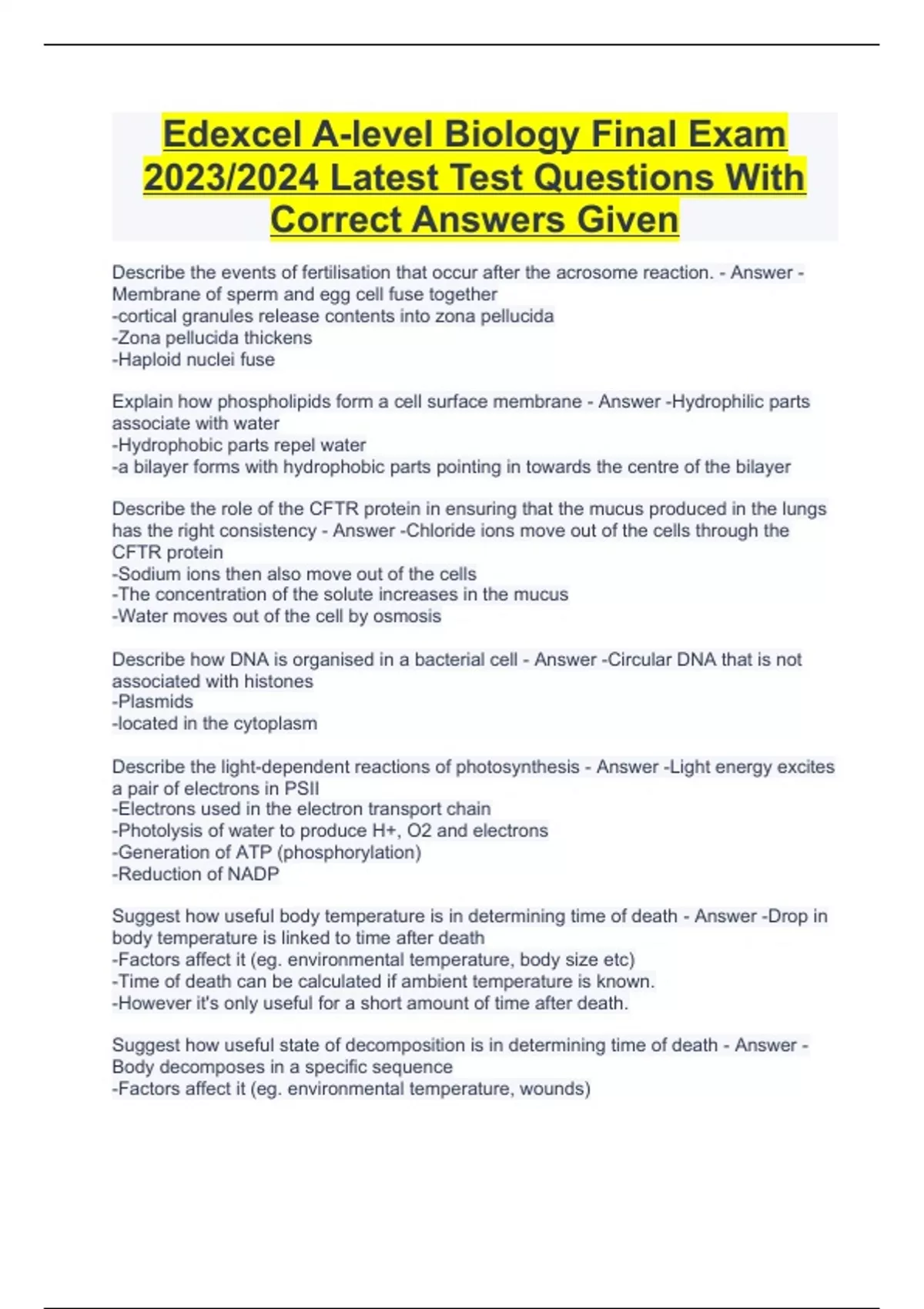 Edexcel A-level Biology Final Exam 2023/2024 Latest Test Questions With Correct Answers Given