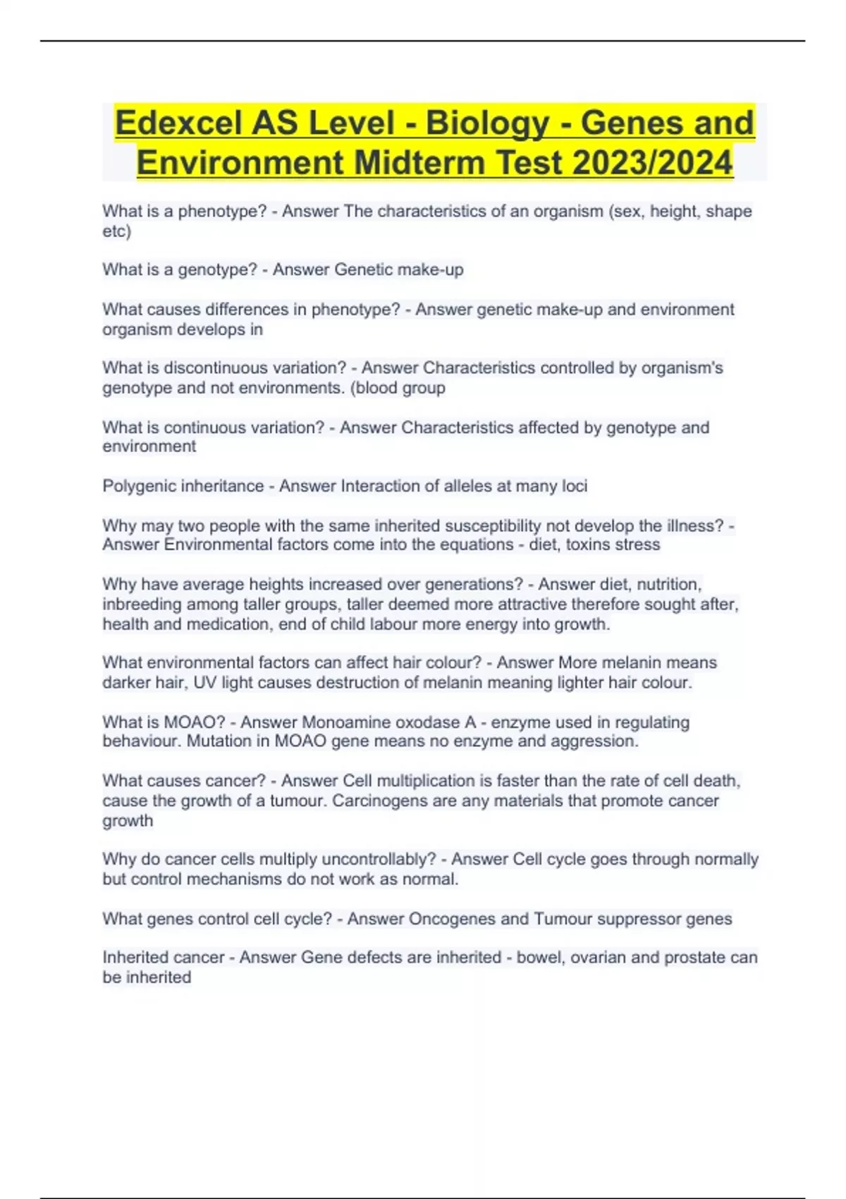 Edexcel AS Level - Biology - Genes and Environment Midterm Test 2023/2024